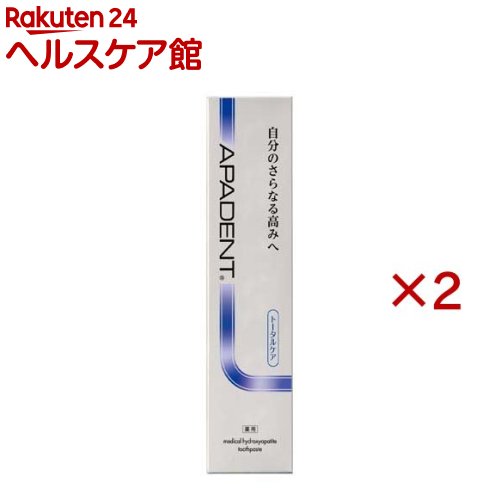 お店TOP>日用品>オーラルケア>歯磨き(ハミガキ)>歯磨き粉>アパデント トータルケア (50g×2セット)商品区分:医薬部外品【アパデント トータルケアの商品詳細】●バランスの良い使い心地。 1980年発売のロングセラー!●むし歯・歯周病・口臭をトータルケア●有効成分「薬用ハイドロキシアパタイト<mHAP>」を配合。 ●歯垢を吸着除去し、歯表面のエナメル質の目に見えないミクロの傷を修復(再結晶化)、歯のミネラル欠損部(初期むし歯※)にミネラルを補給(再石灰化)する3つの作用でむし歯を予防。 ※むし歯の一歩手前の状態●マイルドミントフレーバー【販売名】サンギaFT3【効能 効果】・歯を白くする・むし歯の発生及び進行の予防・歯肉炎の予防・歯槽膿漏の予防・口中を浄化する・口中を爽快にする・口臭の防止・タパコのやに除去【使用方法】歯ブラシに適量(1〜2cm程度)をつけて、薬用成分が作用するよう、よくブラッシングしてください。 特に就寝前は丁寧にブラッシングしてください。 【成分】溶剤:精製水/基剤:歯磨用リン酸水素カルシウム/湿潤剤:濃グリセリン/薬用成分:薬用ハイドロキシアパタイト、ポリエチレングリコール400、ポリビニルピロリドン、β-グリチルレチン酸、塩化セチルピリジニウム、塩酸ピリドキシン/増粘剤:無水ケイ酸/発泡剤:ラウリル硫酸ナトリウム、ラウロイルサルコシンナトリウム/粘結剤:カルボキシメチルセルロースナトリウム/香味剤:香料(ペパーミントタイプ)、サッカリンナトリウム/矯味剤:チャ乾留液、セージエキス、カモミラエキス(1)/安定剤:リン酸マグネシウム/保存剤:塩酸アルキルジアミノエチルグリシン液【注意事項】・万が一、発疹などの異常があらわれた場合は、使用を中止し、医師にご相談下さい。 ・本品は歯みがき剤ですので、飲み込まないようにして下さい。 ・乱暴にみがくと歯、歯肉、歯のかぶせものを傷つけることがあります。 歯科医師、歯科衛生士などの専門家に正しいブラッシングの指導を受けることをお薦めします。 ・使用後は必ずしっかりとフタをし、涼しい所に保管して下さい。 ・乳幼児の手の届かない所に保管して下さい。 【原産国】日本【発売元、製造元、輸入元又は販売元】サンギ※説明文は単品の内容です。 リニューアルに伴い、パッケージ・内容等予告なく変更する場合がございます。 予めご了承ください。 ・単品JAN:4987643123210サンギ104-8440 東京都中央区築地3-11-60120-82-4101広告文責:楽天グループ株式会社電話:050-5577-5042[歯磨き粉 ハミガキ] アパデント トータルケア(50g×2セット) 2,420 ~