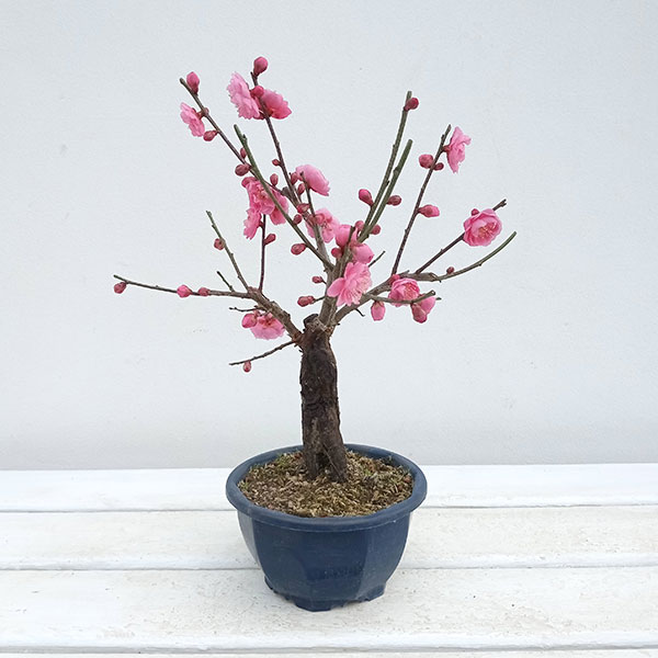 早春の花木花木 庭木の苗/ハナウメ(花梅):大盃(オオサカズキ)盆栽仕立て4号鉢植え香りのよい花が早春から春へ、一輪また一輪と咲くゆかしさがうれしい花木です。 栽培が容易で、木の寿命が長く、古木になるほど味わいが出ます。 盆栽や鉢植えに向く仕立てでこのままお楽しみいただけます。 大盃は紅一重の抱え咲き大輪です。 紅梅性。 早咲き品種です。 タイプ:バラ科の耐寒性落葉高木栽培適地:北海道南部以南植え時:1月〜2月樹高:3m(露地植えの場合)開花:1月〜2月(耐寒性マイナス20度まで)鉢植えの花梅の栽培方法:置き場所は日当たり良く風のあまり当たらない戸外が適しています。 水切れさせないよう注意し、土の表面が乾いたらたっぷり水やりします。 梅は枝がよく伸びるので、花後すぐに「花後剪定」をします。 伸びている枝の緑の部分の下方の芽を残して、枝を短めに切り詰めます。 毎年繰り返して形良く扇形に広がった樹形を作ります。 花後の4月半ば〜5月、収穫後の7月はじめ、12月に根元に肥料を施します。 お届けする苗は4号(直径12cm)鉢植えです。 樹高や樹形は個体差があります。 お届け時期により開花後となる場合がございます。 写真はイメージです。 ハナウメ(花梅):大盃(オオサカズキ)盆栽仕立て4号鉢植えの栽培ガイド花梅(ハナウメ)花桃(ハナモモ)木瓜(ボケ)の育て方 花木 庭木の苗/ハナウメ(花梅):大盃(オオサカズキ)盆栽仕立て4号鉢植え 1,632 ~