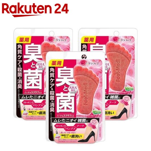 お店TOP>日用品>フットケア>足の臭い対策>足用石鹸・フット洗浄料>フットメジ 薬用フットソープ クリアローズの香り (65g*3セット)商品区分:医薬部外品【フットメジ 薬用フットソープ クリアローズの香りの商品詳細】●女性を意識した薬用足用石けん。 ●角質ケア&殺菌、消臭(※1)。 ●ムレたニオイ、雑菌に。 ●ミョウバンと24種類のハーブ+3種類のスクラブ配合。 ●有効成分として、イソプロピルメチルフェノール、グリチルリチン酸ジカリウム配合。 ●効能:皮膚の清浄、殺菌、消毒。 体臭、汗臭を防ぐ。 ●気になる角質に。 ●AHA配合(※2)。 ※1:マスキング効果による。 ※2:グリコール酸(角質柔軟化成分)【販売名】フットメジ 薬用フットソープ E1【使用方法】・ぬるま湯でネットと石けんを濡らし、ネットをつけたまま足裏を洗ってください。 ・水またはぬるま湯でよくすすぎ洗い流してください。 【成分】有効成分:イソプロピルメチルフェノール、グリチルリチン酸ジカリウムその他の成分:カリウム含有石けん用素地、石けん用素地、パーム核油脂肪酸、パーム脂肪酸、濃グリセリン、アンズ核粒、モモ核粒、クルミ殻粒(1)、硫酸アルミニウムカリウム、カキタンニン、グリコール酸、ウーロン茶エキス、アロエエキス(2)、アルニカエキス、オトギリソウエキス、セイヨウキズタエキス、ハマメリスエキス、ブドウ葉エキス、マロニエエキス、カモミラエキス(1)、シナノキエキス、トウキンセンカエキス、ヤグルマギクエキス、ローマカミツレエキス、ユキノシタエキス、ボタンエキス、カッコンエキス、クララエキス(1)、チャエキス(1)、クワエキス、ベニバナエキス(1)、オウゴンエキス、カワラヨモギエキス、カンゾウ抽出末、ハッカ油、 l-メントール、香料、ポリエチレングリコール4000、ジプロピレングリコール、1、3-ブチレングリコール、エタノール、無水エタノール、ラウロイルメチルタウリンナトリウム、グルコン酸ナトリウム、ヒドロキシエタンジホスホン酸液、エデト酸四ナトリウム四水塩、酸化チタン、ベンガラ、黄色406号、赤色227号【規格概要】角質ケアネット+S字フック付き【注意事項】・足の裏にご使用ください。 ・ネットでのこすりすぎにご注意ください。 また、肌質やお肌の状態に合わせて使いすぎや力の入れすぎにご注意ください。 ・湿疹、皮膚炎(かぶれ、ただれ)等、皮膚障害のある時には、悪化させるおそれがあるので使用しないでください。 使用中に赤み、はれ、かぶれ、かゆみ、刺激等の異常があらわれた場合、使用したお肌に、直射日光があたって同様の異常があらわれた場合には、使用を中止してください。 そのまま使用を続けますと、症状を悪化させることがありますので、皮膚科専門医等へのご相談をおすすめします。 ・目に入らないようご注意ください。 入った場合は、こすらずにすぐに洗い流してください。 目に異物感が残る場合は、眼科医にご相談ください。 ・乳幼児の手の届かない場所に保管してください。 ・極端に高温又は低温の場所、直射日光があたる場所、湿気の多い場所には保管しないでください。 ・本品は植物由来成分を使用しているため、色調の若干差や時間の経過により色が変わる場合がありますが品質には問題ありません。 【原産国】日本【ブランド】フットメジ【発売元、製造元、輸入元又は販売元】グラフィコ※説明文は単品の内容です。 リニューアルに伴い、パッケージ・内容等予告なく変更する場合がございます。 予めご了承ください。 ・単品JAN:4571169854750グラフィコ141-0032 東京都品川区大崎1-6-1 TOC大崎16F0120-498-177広告文責:楽天グループ株式会社電話:050-5577-5043[フットケア/ブランド:フットメジ/] フットメジ 薬用フットソープ クリアローズの香り(65g*3セット)【フットメジ】 3,234 ~