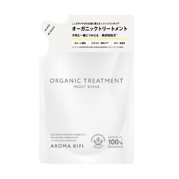 商品詳細商品説明【世界基準の国産オーガニック】世界のオーガニック認証基準に則り開発されたヘアケアシリーズ。 良質な原料を配合しながらも、手に届く価格でお届けします。 女性用のみならず、男性や子供などご家族でお使いいただけます。 【サロン専売品の品質】ノンシリコンのアミノ酸系洗浄成分を使用。 しっかり洗えるのに優しい使い心地で頭皮への負担を軽減。 こだわりのオーガニックボタニカルエキスや毛髪美容成分が、まるでサロン帰りのような保湿とまとまり、サラサラの仕上がりへと導きます。 【天然精油100%】フランスで調香したオリジナルの精油を使用。 天然香料の中でもリラックス効果のあるベルガモット精油やゼラニウム精油をはじめとした、数種類の精油をブレンド。 幾層にも重なり合う精油の香りはバスタイムを上質な時間に。 商品仕様【JANコード】4573492151544【区分】化粧品【内容量】400ml【配合成分】水、アロエベラ液汁、ステアラミドプロピルジメチルアミン、パルミチン酸エチルへキシル、ヒマワリ種子油、べヘニルアルコール、水添ナタネ油アルコール、アロエベラ葉汁、カニナバラ果実エキス、セージ葉エキス、タチジャコウソウ花/葉エキス、ラベンダー葉エキス、ローズマリ?葉エキス、カミツレ葉エキス、レモングラス葉/茎エキス、ラウロイルグルタミン酸ジ(フィトステリル/オクチルドデシル)、ジラウロイルグルタミン酸リシンNa、ポリ-ε-リシン、γ-ドコサラクトン、カラフトコンブエキス、ビワ葉エキス、ボタンエキス、ミリスチン酸イソプロピル、トリ(カプリル酸/カプリン酸)グリセリル、ダイマージリノール酸ダイマージリノレイル、ダイマージリノール酸、(フィトステリル/イソステアリル/セチル/ステアリル/べヘニル)、セバシン酸ジエチル、カウナウバロウ、ヒドロキシエチルセルロース、ココアンホ酢酸Na、ステアルトリモニウムクロリド、BG、乳酸、クエン酸、エチドロン酸、フェノキシエタノール、香料【使用方法】シャンプーのあと軽く水気をきり、適量を髪全体になじませたあとしばらくおき、よくすすいでください。 髪が特に傷んでいる場合は髪になじませたあと2?3分おいてからすすぐと効果的です。 【使用上の注意】・傷、はれもの、しっしん等、異常のある部位には使用しないでください。 ・次のような方は使用前に医師にご相談ください。 1.医師の治療を受けている方、2.湿疹やただれのひどい方・使用中や使用後、皮膚に発疹、発赤、かゆみ、はれ、刺激などの異常があらわれた場合は直ちに使用を中止し、医師にご相談ください。 ・目に入らないようにご注意ください。 万一、目に入った場合にはすぐに水またはぬるま湯で洗い流してください。 なお異常がある場合には医師の診察を受けてください。 ・次のところには保管しないでください。 1.極端に低温または高温のところ、2.直射日光の当たるところ、3.乳幼児の手の届くところ・開封時はなるべく早くお使いください。 ・本製品は天然由来成分を多く配合しているため、気温や保管状況によっては色調や性状に違いが生じる場合がございます。 なお、ご使用には問題ございません。 【製造国】日本【製造・販売/輸入元】株式会社ビジナル広告問責株式会社フューテック/TEL:050-3609-3530商品関連キーワード AROMA KIFI アロマキフィ オーガニック トリートメント モイストシャイン つめかえ 400ml 1,155 ~