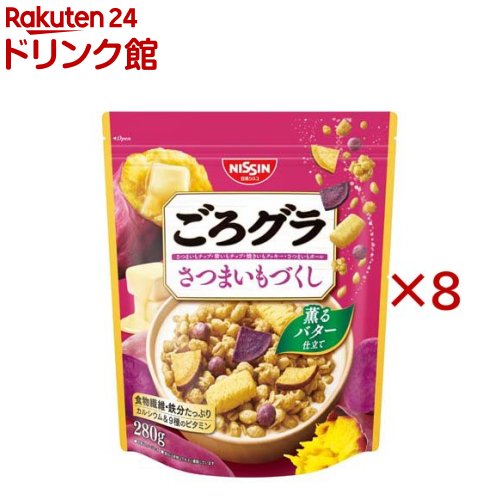お店TOP>フード>穀物・豆・麺類>シリアル類>グラノーラ・クランチ>ごろグラ さつまいもづくし (280g×8セット)【ごろグラ さつまいもづくしの商品詳細】●心をくすぐる、ときめくおいしさ!●贅沢なごろっとさつまいもとザクザク食感の焼きいもクッキーが入った、薫るバター仕立てのグラノーラ【品名・名称】シリアル【ごろグラ さつまいもづくしの原材料】オーツ麦フレーク(オーストラリア製造又はイギリス製造又はその他)、小麦シリアルパフ(大豆を含む)、ライ麦シリアルパフ(コーングリッツ、ライ麦粉、小麦粉、その他)、焼きいもクッキー(小麦粉、砂糖、ショートニング、でん粉、発酵バター、さつまいもパウダー、食塩)、砂糖、植物油脂、水溶性食物繊維、乾燥さつまいも加工品、デキストリン、乾燥紫いも加工品、さつまいもパウダー加工品(砂糖、小麦粉、ショートニング、植物油脂、さつまいもパウダー)、食塩、乳糖、発酵バター、さつまいもパウダー/炭酸カルシウム、香料、ビタミンC、乳化剤、着色料(クチナシ、フラボノイド、アントシアニン)、酸化防止剤(ビタミンE、ビタミンC)、ピロリン酸鉄、ナイアシン、カゼインNa、パントテン酸カルシウム、ビタミンB6、ビタミンB1、ビタミンB2、葉酸、ビタミンD、ビタミンB12【栄養成分】1食分(40g)当たりエネルギー(kcal):174、たんぱく質(g):2.8、脂質(g):6.4、コレステロール(mg):0、炭水化物(g):28.9、-糖質(g):24.8、-食物繊維(g):4.1、食塩相当量(g):0.25、カルシウム(mg):51、鉄(mg):4.2、ナイアシン(mg):3.0、パントテン酸(mg):0.60、ビタミンB1(mg):0.29、ビタミンB2(mg):0.11、ビタミンB6(mg):0.40、ビタミンB12(μg):0.34、ビタミンC(mg):27、ビタミンD(μg):3.0、葉酸(μg):80、リン(mg):56、カリウム(mg):76【アレルギー物質】小麦・乳成分・大豆【保存方法】直射日光・高温多湿をおさけください。 【原産国】日本【発売元、製造元、輸入元又は販売元】日清シスコ※説明文は単品の内容です。 リニューアルに伴い、パッケージ・内容等予告なく変更する場合がございます。 予めご了承ください。 ・単品JAN:4901620161491日清シスコ110-0015 東京都台東区東上野4-24-11 グローバル・ワン上野11階0120-937-023広告文責:楽天グループ株式会社電話:050-5577-5043[インスタント食品] ごろグラ さつまいもづくし(280g×8セット) 4,924 ~