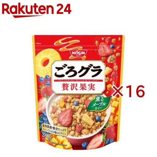 お店TOP>フード>穀物・豆・麺類>シリアル類>グラノーラ・クランチ>ごろグラ 贅沢果実 (280g×16セット)【ごろグラ 贅沢果実の商品詳細】●具材が大きくて多い、アガるおいしさ!●贅沢なごろっと果実とザクザク食感のシリアルが入った、薫るメープル仕立てのグラノーラ【品名・名称】シリアル【ごろグラ 贅沢果実の原材料】オーツ麦フレーク(オーストラリア製造又はイギリス製造又はその他)、小麦シリアルパフ(大豆を含む)、ライ麦シリアルパフ(コーングリッツ、ライ麦粉、小麦粉、その他)、砂糖、植物油脂、水溶性食物繊維、乾燥パイナップル加工品、デキストリン、乾燥いちご加工品、乾燥マンゴー加工品、ブルーベリーパフ加工品(砂糖、小麦粉、コーングリッツ、食塩、ブルーベリー果汁パウダー)、乳糖、メープルシロップ/グルコン酸カルシウム、加工でん粉、ビタミンC、乳化剤、着色料(カロチン、クチナシ、アントシアニン)、パプリカ色素、酸味料、香料、酸化防止剤(ビタミンE、ビタミンC、ローズマリー抽出物)、ピロリン酸鉄、増粘剤(アラビアガム)、カゼインNa、光沢剤、ナイアシン、パントテン酸カルシウム、ビタミンB6、ビタミンB1、ビタミンB2、葉酸、ビタミンD、ビタミンB12【栄養成分】1食分(40g)当たりエネルギー(kcal):164、たんぱく質(g):2.6、脂質(g):5.0、コレステロール(mg):0、炭水化物(g):30.2、-糖質(g):25.8、-食物繊維(g):4.4、食塩相当量(g):0.25、カルシウム(mg):51、鉄(mg):4.2、ナイアシン(mg):3.0、パントテン酸(mg):0.60、ビタミンB1(mg):0.29、ビタミンB2(mg):0.11、ビタミンB6(mg):0.36、ビタミンB12(μg):0.32、ビタミンC(mg):24、ビタミンD(μg):2.6、葉酸(μg):80、リン(mg):61、カリウム(mg):83【アレルギー物質】小麦・乳成分・大豆【保存方法】直射日光・高温多湿をおさけください。 【原産国】日本【発売元、製造元、輸入元又は販売元】日清シスコ※説明文は単品の内容です。 リニューアルに伴い、パッケージ・内容等予告なく変更する場合がございます。 予めご了承ください。 ・単品JAN:4901620160135日清シスコ110-0015 東京都台東区東上野4-24-11 グローバル・ワン上野11階0120-937-023広告文責:楽天グループ株式会社電話:050-5577-5043[インスタント食品] ごろグラ 贅沢果実(280g×16セット) 9,653 ~