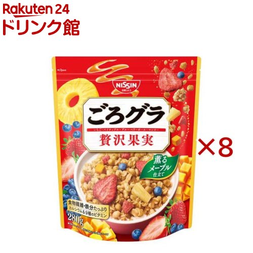 お店TOP>フード>穀物・豆・麺類>シリアル類>グラノーラ・クランチ>ごろグラ 贅沢果実 (280g×8セット)【ごろグラ 贅沢果実の商品詳細】●具材が大きくて多い、アガるおいしさ!●贅沢なごろっと果実とザクザク食感のシリアルが入った、薫るメープル仕立てのグラノーラ【品名・名称】シリアル【ごろグラ 贅沢果実の原材料】オーツ麦フレーク(オーストラリア製造又はイギリス製造又はその他)、小麦シリアルパフ(大豆を含む)、ライ麦シリアルパフ(コーングリッツ、ライ麦粉、小麦粉、その他)、砂糖、植物油脂、水溶性食物繊維、乾燥パイナップル加工品、デキストリン、乾燥いちご加工品、乾燥マンゴー加工品、ブルーベリーパフ加工品(砂糖、小麦粉、コーングリッツ、食塩、ブルーベリー果汁パウダー)、乳糖、メープルシロップ/グルコン酸カルシウム、加工でん粉、ビタミンC、乳化剤、着色料(カロチン、クチナシ、アントシアニン)、パプリカ色素、酸味料、香料、酸化防止剤(ビタミンE、ビタミンC、ローズマリー抽出物)、ピロリン酸鉄、増粘剤(アラビアガム)、カゼインNa、光沢剤、ナイアシン、パントテン酸カルシウム、ビタミンB6、ビタミンB1、ビタミンB2、葉酸、ビタミンD、ビタミンB12【栄養成分】1食分(40g)当たりエネルギー(kcal):164、たんぱく質(g):2.6、脂質(g):5.0、コレステロール(mg):0、炭水化物(g):30.2、-糖質(g):25.8、-食物繊維(g):4.4、食塩相当量(g):0.25、カルシウム(mg):51、鉄(mg):4.2、ナイアシン(mg):3.0、パントテン酸(mg):0.60、ビタミンB1(mg):0.29、ビタミンB2(mg):0.11、ビタミンB6(mg):0.36、ビタミンB12(μg):0.32、ビタミンC(mg):24、ビタミンD(μg):2.6、葉酸(μg):80、リン(mg):61、カリウム(mg):83【アレルギー物質】小麦・乳成分・大豆【保存方法】直射日光・高温多湿をおさけください。 【原産国】日本【発売元、製造元、輸入元又は販売元】日清シスコ※説明文は単品の内容です。 リニューアルに伴い、パッケージ・内容等予告なく変更する場合がございます。 予めご了承ください。 ・単品JAN:4901620160135日清シスコ110-0015 東京都台東区東上野4-24-11 グローバル・ワン上野11階0120-937-023広告文責:楽天グループ株式会社電話:050-5577-5043[インスタント食品] ごろグラ 贅沢果実(280g×8セット) 4,875 ~