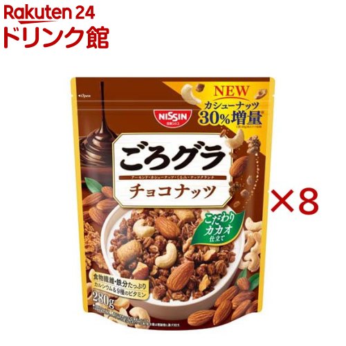 お店TOP>ごろグラ チョコナッツ (280g×8セット)【ごろグラ チョコナッツの商品詳細】●カシューナッツ入り!具材が大きくて多い、アガるおいしさ!●贅沢なごろっとナッツとザクザク食感のナッツクランチが入った、こだわりカカオ仕立てのグラノーラ【品名・名称】シリアル【ごろグラ チョコナッツの原材料】オーツ麦フレーク(オーストラリア製造又はイギリス製造又はその他)、小麦シリアルパフ(大豆を含む)、砂糖、ライ麦シリアルパフ(コーングリッツ、ライ麦粉、小麦粉、その他)、植物油脂、アーモンド、カシューナッツ、水溶性食物繊維、ナッツクランチ(小麦粉、砂糖、ショートニング、ココナッツ、でん粉、食塩、ヘーゼルナッツペースト、アーモンドパウダー)、ココアパウダー、くるみ、デキストリン、乳糖、カカオマス/炭酸カルシウム、香料、乳化剤、ビタミンC、酸化防止剤(ビタミンE、ビタミンC)、ピロリン酸鉄、カラメル色素、ナイアシン、カゼインNa、パントテン酸カルシウム、ビタミンB6、ビタミンB1、ビタミンB2、葉酸、ビタミンD、ビタミンB12【栄養成分】1食分(40g)当たりエネルギー(kcal):176、たんぱく質(g):3.3、脂質(g):7.1、コレステロール(mg):0、炭水化物(g):27.7、-糖質(g):23.3、-食物繊維(g):4.4、食塩相当量(g):0.24、カルシウム(mg):51、鉄(mg):2.8、ナイアシン(mg):3.2、パントテン酸(mg):0.64、ビタミンB1(mg):0.32、ビタミンB2(mg):0.13、ビタミンB6(mg):0.40、ビタミンB12(μg):0.32、ビタミンC(mg):28、ビタミンD(μg):2.8、葉酸(μg):86、リン(mg):78、カリウム(mg):110【アレルギー物質】くるみ・小麦・乳成分・アーモンド・カシューナッツ・大豆【保存方法】直射日光・高温多湿をおさけください。 【原産国】日本【発売元、製造元、輸入元又は販売元】日清シスコ※説明文は単品の内容です。 リニューアルに伴い、パッケージ・内容等予告なく変更する場合がございます。 予めご了承ください。 ・単品JAN:4901620161330日清シスコ110-0015 東京都台東区東上野4-24-11 グローバル・ワン上野11階0120-937-023広告文責:楽天グループ株式会社電話:050-5306-1825[インスタント食品] ごろグラ チョコナッツ(280g×8セット) 4,875 ~
