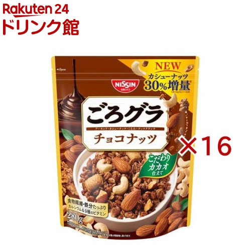 お店TOP>フード>穀物・豆・麺類>シリアル類>グラノーラ・クランチ>ごろグラ チョコナッツ (280g×16セット)【ごろグラ チョコナッツの商品詳細】●カシューナッツ入り!具材が大きくて多い、アガるおいしさ!●贅沢なごろっとナッツとザクザク食感のナッツクランチが入った、こだわりカカオ仕立てのグラノーラ【品名・名称】シリアル【ごろグラ チョコナッツの原材料】オーツ麦フレーク(オーストラリア製造又はイギリス製造又はその他)、小麦シリアルパフ(大豆を含む)、砂糖、ライ麦シリアルパフ(コーングリッツ、ライ麦粉、小麦粉、その他)、植物油脂、アーモンド、カシューナッツ、水溶性食物繊維、ナッツクランチ(小麦粉、砂糖、ショートニング、ココナッツ、でん粉、食塩、ヘーゼルナッツペースト、アーモンドパウダー)、ココアパウダー、くるみ、デキストリン、乳糖、カカオマス/炭酸カルシウム、香料、乳化剤、ビタミンC、酸化防止剤(ビタミンE、ビタミンC)、ピロリン酸鉄、カラメル色素、ナイアシン、カゼインNa、パントテン酸カルシウム、ビタミンB6、ビタミンB1、ビタミンB2、葉酸、ビタミンD、ビタミンB12【栄養成分】1食分(40g)当たりエネルギー(kcal):176、たんぱく質(g):3.3、脂質(g):7.1、コレステロール(mg):0、炭水化物(g):27.7、-糖質(g):23.3、-食物繊維(g):4.4、食塩相当量(g):0.24、カルシウム(mg):51、鉄(mg):2.8、ナイアシン(mg):3.2、パントテン酸(mg):0.64、ビタミンB1(mg):0.32、ビタミンB2(mg):0.13、ビタミンB6(mg):0.40、ビタミンB12(μg):0.32、ビタミンC(mg):28、ビタミンD(μg):2.8、葉酸(μg):86、リン(mg):78、カリウム(mg):110【アレルギー物質】くるみ・小麦・乳成分・アーモンド・カシューナッツ・大豆【保存方法】直射日光・高温多湿をおさけください。 【原産国】日本【発売元、製造元、輸入元又は販売元】日清シスコ※説明文は単品の内容です。 リニューアルに伴い、パッケージ・内容等予告なく変更する場合がございます。 予めご了承ください。 ・単品JAN:4901620161330日清シスコ110-0015 東京都台東区東上野4-24-11 グローバル・ワン上野11階0120-937-023広告文責:楽天グループ株式会社電話:050-5577-5043[インスタント食品] ごろグラ チョコナッツ(280g×16セット) 9,653 ~