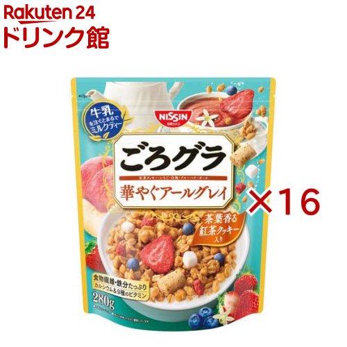 お店TOP>ごろグラ 華やぐアールグレイ (280g×16セット)【ごろグラ 華やぐアールグレイの商品詳細】●心をくすぐる、ときめくおいしさ!●贅沢なごろっと果実と茶葉香る紅茶クッキーが入った、アールグレイの香りが広がるグラノーラ【品名・名称】シリアル【ごろグラ 華やぐアールグレイの原材料】オーツ麦フレーク(オーストラリア製造又はイギリス製造又はその他)、小麦シリアルパフ(大豆を含む)、ライ麦シリアルパフ(コーングリッツ、ライ麦粉、小麦粉、その他)、砂糖、植物油脂、水溶性食物繊維、紅茶クッキー(小麦粉、砂糖、ショートニング、でん粉、発酵バター、紅茶葉、食塩)、デキストリン、乾燥いちご加工品、ブルーベリーパフ加工品(砂糖、小麦粉、コーングリッツ、食塩、ブルーベリー果汁パウダー)、乾燥白桃加工品、紅茶エキス、乳糖/着色料(カラメル、クチナシ、アントシアニン)、炭酸カルシウム、加工でん粉、乳化剤、ビタミンC、酸味料、香料、酸化防止剤(ビタミンE、ビタミンC、ローズマリー抽出物)、ピロリン酸鉄、増粘剤(アラビアガム)、光沢剤、カゼインNa、ナイアシン、パントテン酸カルシウム、ビタミンB6、ビタミンB1、ビタミンB2、葉酸、ビタミンD、ビタミンB12【栄養成分】1食分(40g)当たりエネルギー(kcal):164、たんぱく質(g):2.6、脂質(g):5.0、コレステロール(mg):0、炭水化物(g):30.2、-糖質(g):25.8、-食物繊維(g):4.4、食塩相当量(g):0.25、カルシウム(mg):51、鉄(mg):4.2、ナイアシン(mg):3.0、パントテン酸(mg):0.60、ビタミンB1(mg):0.29、ビタミンB2(mg):0.11、ビタミンB6(mg):0.36、ビタミンB12(μg)0.32、ビタミンC(mg):24、ビタミンD(μg)2.6、葉酸(μg)80、リン(mg):55、カリウム(mg):68【アレルギー物質】小麦・乳成分・大豆・もも【保存方法】直射日光・高温多湿をおさけください。 【原産国】日本【発売元、製造元、輸入元又は販売元】日清シスコ※説明文は単品の内容です。 リニューアルに伴い、パッケージ・内容等予告なく変更する場合がございます。 予めご了承ください。 ・単品JAN:4901620161842日清シスコ110-0015 東京都台東区東上野4-24-11 グローバル・ワン上野11階0120-937-023広告文責:楽天グループ株式会社電話:050-5306-1825[インスタント食品] ごろグラ 華やぐアールグレイ(280g×16セット) 9,653 ~