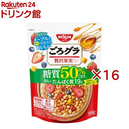 お店TOP>ごろグラ 糖質50%オフ 贅沢果実 (300g×16セット)【ごろグラ 糖質50%オフ 贅沢果実の商品詳細】●このおいしさで、圧倒的糖質オフ! ●贅沢なごろっと果実とザクザク食感のシリアルが入った、薫るメープル仕立ての糖質50%※オフグラノーラ※「ごろグラ贅沢果実」と同重量で比較【品名・名称】シリアル【ごろグラ 糖質50%オフ 贅沢果実の原材料】植物性たんぱくパフ(濃縮大豆たんぱく粉(大豆(中国産))、小麦たんぱく粉、でん粉、食塩)、オーツ麦フレーク、植物油脂、水溶性食物繊維、植物性たんぱくシリアルパフ(濃縮大豆たんぱく粉、小麦たんぱく粉、でん粉、ライ麦粉、玄米粉、小麦ふすま)、乾燥いちご加工品、砂糖、メープルシロップ、ブルーベリーパフ加工品(砂糖、小麦粉、コーングリッツ、食塩、ブルーベリー果汁パウダー)、乾燥マンゴー加工品、乳糖/炭酸カルシウム、香料、加工でん粉、ビタミンC、乳化剤、着色料(カラメル、カロチン、クチナシ、アントシアニン)、パプリカ色素、ピロリン酸鉄、甘味料(アセスルファムK、スクラロース)、酸味料、酸化防止剤(ビタミンE、ビタミンC、ローズマリー抽出物)、増粘剤(アラビアガム)、ナイアシン、光沢剤、パントテン酸カルシウム、ビタミンB6、ビタミンB1、ビタミンB2、葉酸、ビタミンD、ビタミンB12【栄養成分】1食分(50g)当たり/牛乳200mlをかけた場合エネルギー(kcal):210/336、たんぱく質(g):12.2/19.0、脂質(g):10.4/18.2、コレステロール(mg):0/25、炭水化物(g):24.6/34.5、糖質(g):14.8/24.7、食物繊維(g):9.8/9.8、食塩相当量(g):0.23/0.44、カルシウム(mg):110/337、鉄(mg):6.9/6.9、ナイアシン(mg):5.0/5.2、パントテン酸(mg):0.70/1.84、ビタミンB1(mg):0.43/0.51、ビタミンB2(mg):0.17/0.48、ビタミンB6(mg):0.50/0.56、ビタミンB12(μg):0.38/1.00、ビタミンC(mg):32/34、ビタミンD(μg):3.8/4.4、葉酸(μg):135/145、リン(mg):161/353、カリウム(mg):222/532【アレルギー物質】小麦・乳成分・大豆【保存方法】直射日光・高温多湿をおさけください。 【原産国】日本【発売元、製造元、輸入元又は販売元】日清シスコ※説明文は単品の内容です。 リニューアルに伴い、パッケージ・内容等予告なく変更する場合がございます。 予めご了承ください。 ・単品JAN:4901620161767日清シスコ110-0015 東京都台東区東上野4-24-11 グローバル・ワン上野11階0120-937-023広告文責:楽天グループ株式会社電話:050-5306-1825[インスタント食品] ごろグラ 糖質50%オフ 贅沢果実(300g×16セット) 9,653 ~