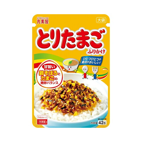 ご注文前にご確認ください※ 12時から14時の時間帯指定はできません。 ご指定の場合は14時から16時にて手配いたします。 商品説明★ 鶏そぼろとたまごの二色丼をイメージしました。 醤油と砂糖で味付けした鶏そぼろの甘旨い味わいと、たまごそぼろのコクと風味を楽しめます。 甘さが特徴の優しい味付けなので、家族みんなで楽しめます。 お得で使いやすい大袋タイプです。 ※表示画像はイメージであり実物とは色味が異なる場合がございます。 ※メーカーの都合により、パッケージ・仕様・成分・生産国等は予告なく変更になる場合がございます。 ※上記理由でのご返品はお受けできませんので、事前お問合せなどご注意のほど宜しくお願いいたします。 スペック* 内容量:42g* サイズ:16×130×190 丸美屋 とりたまごふりかけ 大袋 42g×10 メーカー直送 プレゼント ギフト 3,960 ~