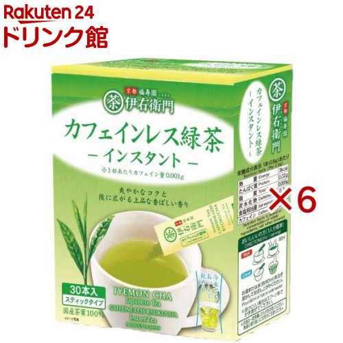 お店TOP>お茶>お茶 その他>伊右衛門 カフェインレスインスタント緑茶 (30本入×6セット)【伊右衛門 カフェインレスインスタント緑茶の商品詳細】●冷水でもさっと溶けるインスタントスティックタイプです。 ●1杯当たりのカフェイン量0.001gに設定。 ●粉末茶をブレンドし、飲みごたえのある味わいと口に広がる香りを追求しました。 【召し上がり方】お湯または水(約80mL)を注ぎ溶かしてお召し上がりください。 【品名・名称】インスタントティー【伊右衛門 カフェインレスインスタント緑茶の原材料】緑茶(国産)、デキストリン/酸化防止剤(V.C)【栄養成分】1本(0.8g)あたり熱量:3kcal、たんぱく質:0.02g、脂質:0.005g、炭水化物:0.7g、食塩相当量:0.002gカフェイン:0.001g【アレルギー物質】記載なし【保存方法】高温多湿を避け、移り香にご注意ください。 【注意事項】開封後は早めにお飲みください【ブランド】伊右衛門【発売元、製造元、輸入元又は販売元】宇治の露製茶※説明文は単品の内容です。 リニューアルに伴い、パッケージ・内容等予告なく変更する場合がございます。 予めご了承ください。 ・単品JAN:4901046781372宇治の露製茶619-0204 京都府木津川市山城町上狛東作り道500120-470185広告文責:楽天グループ株式会社電話:050-5306-1825[お茶/ブランド:伊右衛門/] 伊右衛門 カフェインレスインスタント緑茶(30本入×6セット)【伊右衛門】 4,536 ~