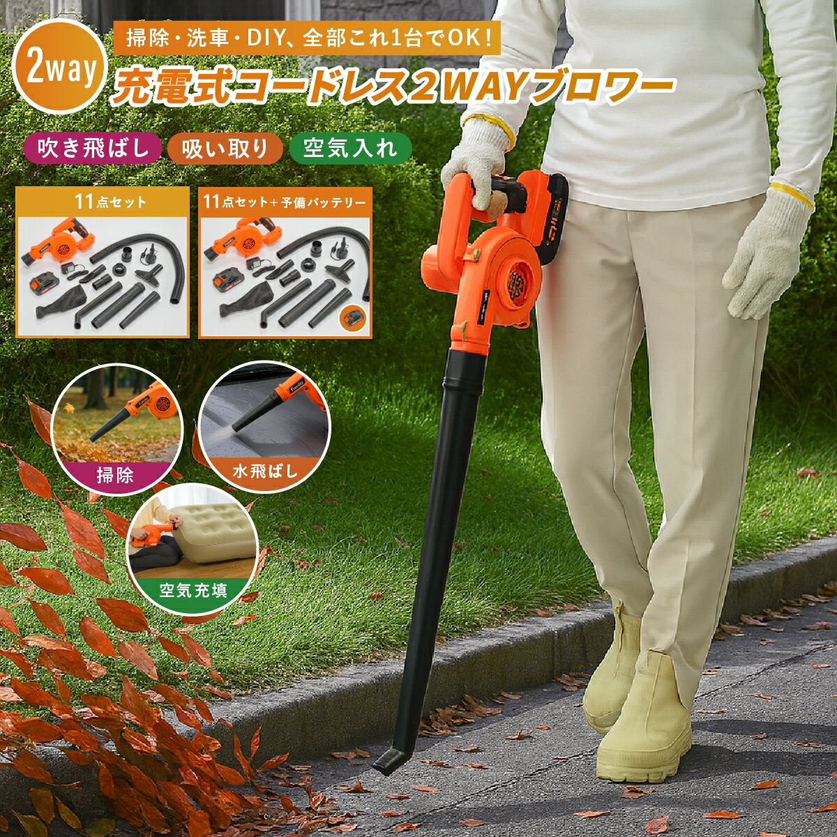 吹く・吸うの2WAY仕様で清掃に大活躍! バッテリー充電式のブロワ&バキューム掃除機です 落ち葉の清掃 / 水滴の吹き飛ばし / 埃や木屑の吸い込み 送風(吹き飛ばし) / 落ち葉・雑草・水滴 吸塵(吸い込み) / 埃・木屑・砂 製品仕様 バッテリー / 24V リチウムイオン電池 連続稼働時間 / 10〜20分 充電時間 / 4〜5時間 出力 / 380W 電圧 / 21V 風量 / 2.8m 3/min 空載回転数 / 18000r/min サイズ / 約W330mm×H190mm×D170mm 重量 / 約1.2kg 素材 / ABS 注意事項 ・モニターの発色具合によって実際の物と色が異なる場合がございます ・掲載画像はイメージであり、実際の製品とは多少異なる場合があります ・製品の仕様は品質の向上・改善のため、予告なく変更となる場合があります関連商品散水 ホース ステンレスコイルホース 10m ウォーターガン付き ガ...クリップ & スタンド式 ミスト サーキュレーター 9インチ 大型 卓...サポートチェア スワンル ハイカジュアル 姿勢矯正 椅子 クッション ...4,980円5,980円5,980円高級 剪定ばさみ 8インチ S型 プロ仕様 園芸用品 家庭用 鍛造刃 ...【日本製・安全マーク取得】電子レンジ調理器 圧力鍋 極み味 2.3L ...やかん 日本製 キューブケトル 2.8L そのまま冷蔵庫へ 麦茶 ステ...1,000円5,980円5,980円刈込鋏 アルミ 刈り込みバサミ 全長約675mm 軽量 アルミボディ ...高圧洗浄 クリーン ノズル 高水圧 強力洗浄 洗車 清掃 水まき 水や...高水圧 パワフル ノズル 強力洗浄 洗車 清掃 水まき 水やり 打ち水...1,330円1,980円1,780円【★期間限定★ポイント5倍★】 散水ホース ノズル セット 巻き取り不...【特別コラボ商品!!】ウッドスティック & エンジョイボッチャ セット...充電式チェーンソー 充電式ハンディソー ハンディチェーンソー 電動チェ...2,400円6,280円4,980円 ブロワー & バキューム 吹く 吸う 2way ブロアー ブロワ 充電式 コードレス 軽量 洗車 清掃 5,480 ~