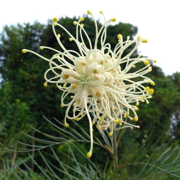 グレヴィレア アイボリー色の花・四季咲き性が強い品種 オージープランツ・常緑低木花木 庭木の苗/グレビレア:ムーンライト5号鉢植えグレヴィレア属は主にオーストラリアに250種が分布する常緑低木です。 花の形と葉の切れ込みに特徴があり、非常に美しい花が咲きます。 ムーンライトは切れ込みの深い細い葉で、強く伸びた枝の先端に澄んだアイボリー色の花を咲かせます。 四季咲き性が強い品種で強剪定にも耐えます。 タイプグレヴィレア属の半耐寒性常緑低木樹高2-5m開花期四季咲き耐寒性マイナス4度まで日照日向むき栽培方法:日当たりの良い場所で、排水の良い土を好みます。 育てやすい品種ですが、耐寒性がやや弱いので庭植えは関東地方以南の太平洋側で。 冬場は根元に腐葉土などでマルチングし、防寒してください。 寒い地方では鉢植えにして冬季は室内にとりこんでください。 やせ地で育つため、追肥はほとんど必要ありませんが、与える場合は春もしくは秋の年1回に控えめに与えます。 強めの肥料を与えると、葉が黄色く痛む場合がございますのでご注意ください。 特にリン酸肥料は与えないように注意してください。 5号(直径15cm)ポット入りです。 樹高は多少変動します。 写真は成長、開花時のイメージです。 グレビレア:ムーンライト5号鉢植えの栽培ガイド年間通して花が楽しめる!ワイルドフラワー・グレビレア 花木 庭木の苗/グレビレア:ムーンライト5号鉢植え 5,013 ~