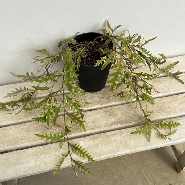 春と秋に開花する斑入りの這性グレヴィレア花木 庭木の苗/グレビレア:サンキストウォーター6号鉢植えグレヴィレア属は主にオーストラリアに250種が分布する常緑低木です。 花の形と葉の切れ込みに特徴があり、非常に美しい花が咲きます。 サンキストウォーターは葉の縁にクリーム色の斑が入る這性の品種。 若葉は赤みを帯び、春と秋に赤い花を咲かせます。 枝が良く枝垂れるのでスタンダード仕立てにも適しています。 また庭植えすればグランドカバーにもなります。 コンテナでインドア等、花壇や法面にもおすすめです。 学名:Grevillea 'Sunkissed Waters'タイプ:グレヴィレア属の半耐寒性常緑低木開花期:春と秋耐寒性:マイナス5度まで日照:日向むき栽培方法:日当たりの良い場所で、排水の良い土を好みます。 育てやすい品種ですが、耐寒性がやや弱いので庭植えは関東地方以南の太平洋側で。 冬場は根元に腐葉土などでマルチングし、防寒してください。 寒い地方では鉢植えにして冬季は室内にとりこんでください。 やせ地で育つため、追肥はほとんど必要ありませんが、与える場合は春もしくは秋の年1回に控えめに与えます。 強めの肥料を与えると、葉が黄色く痛む場合がございますのでご注意ください。 特にリン酸肥料は与えないように注意してください。 お届けする苗は6号(直径18cm)鉢植え、葉張り約30-50cmです。 葉張りは入荷時期により多少変動いたします。 露地管理苗のため、夏以降などお届け時期により多少の葉焼けなどで葉がきれいでない状態の場合があります。 写真はイメージです。 グレビレア:サンキストウォーター6号鉢植えの栽培ガイド年間通して花が楽しめる!ワイルドフラワー・グレビレア 花木 庭木の苗/グレビレア:サンキストウォーター6号鉢植え 5,013 ~