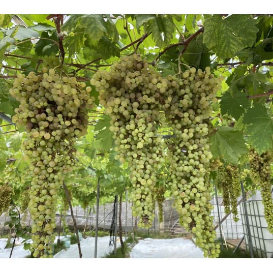 インパクト満点白三尺ブドウ・最も長い房になる欧州種果樹の苗/[26年4月下旬予約]ブドウ:ネヘレスコール挿木苗4〜5号ポットネヘレスコールはブドウで最も長い房になる品種で、大きい房では長さ1m近く、重さは3kg以上にもなり、観賞用としても価値が高いブドウです。 味も見た目のインパクトに負けず、糖度は20度以上と甘く、香りは少ないですが、プリプリした食感でジューシー、とてもおいしいブドウです。 干しブドウにできます。 強健で栽培も容易なので、家庭園芸におすすめ。 市場にはほとんど出回らない大変珍しい品種です。 タイプ:ブドウ科の耐寒性落葉樹(つる性)果皮色:黄緑色果重:最大3kg以上糖度:約20度成熟期:9月中旬〜下旬日照:日向むき栽培方法:日当たり・水はけのよい場所が適しています。 地植えの場合はなるべく深く穴を掘り、有機肥料を元肥えとして施して植え付けます。 鉢植えの場合も同様になるべく深い鉢を選んで植えてください。 植え付け後は3〜5芽を残し、地際から30cmくらいのところで切戻し、支柱を立て、枝を誘引して止めつけます。 仕立て方としてはまっすぐの棒に巻きつけるように上方に伸ばす棒仕立て、またはぶどう棚や垣根に誘引する仕立て方があります。 鉢植えの場合はあんどん仕立てにすると良いでしょう。 肥料は3月と11〜12月に、根本に有機肥料などを施します。 大粒種の場合、自然の状態では果粒数が少なくなりますので、実どまりをよくするために、花の満開時期にジベレリンの100倍溶液に花穂をひたすか、開花直前に花房の先端を1/3ほどきりつめます。 また、チッソ肥料が多すぎると葉ばかり茂って実がつきにくいので、窒素分を控えるのも有効です。 花後に結実した実には袋かけをして、病虫害や鳥害から守ります。 剪定は12月〜1月に、前年に伸びた枝を切り戻してください。 4〜5号ポット入りの挿木苗、樹高約60cmです。 結実開始は3〜4年後からとなります。 樹高は、多少前後します。 また、夏〜秋のお届け時は葉の状態がきれいでない場合があります。 ※1年生苗は鉢上げして時間が経過していないため、枝数や小根が少い場合がありますが、生育に問題はありません。 ■4月下旬頃のお届けの予約販売です。 ・注文締切日:2026年4月13日(月)午前7時・別々のご注文をおまとめすることはできません。 送料はそれぞれにかかります。 ・お届け日は4月14日以降にメールでご案内します。 お届け日指定はお受けできませんが、曜日・時間帯指定は承ります。 (受信できるアドレスでご注文ください)・品種によりお届け時期の変更や、お届けできなくなる場合があります。