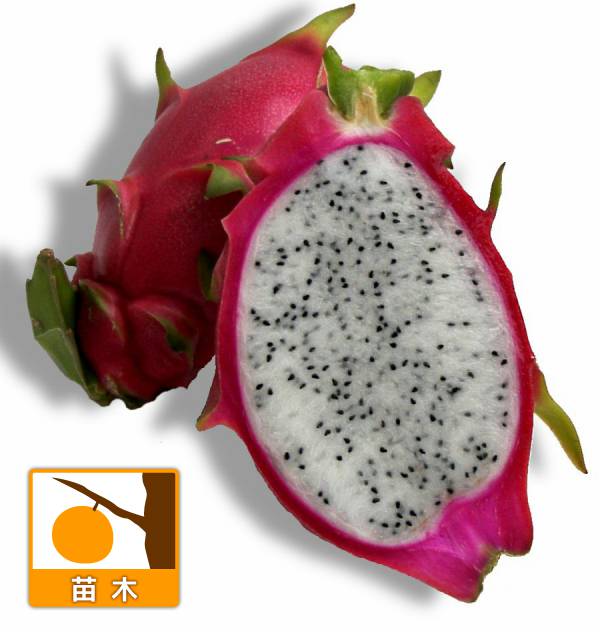 食用サボテン 白花・夜に開花します果樹の苗/[26年4月下旬予約]ドラゴンフルーツ:白肉3.5号ポットドラゴンフルーツは南アフリカ〜中央メキシコ原産の月下美人の仲間で、ピタヤとも呼ばれます。 花は白花で夜に開花し、美しく鑑賞できます。 果実はフルーツとして生食でき、東南アジアなどで広く栽培されています。 果実はビタミン、繊維、ブドウ糖やミネラルを多く含み、また果実の中にある種子は便秘を改善するため美容フルーツとしても人気が高まっています。 6〜10月に開花結実しますが、2品種以上を一緒に植えて交配させてください。 異なる品種ならどの品種同士でも交配できます。 開花・結実は通常2〜3年目からとなります。 タイプ:サボテン科の非耐寒性多肉植物草丈:1〜2m日照:日向むき置き場所:明るい場所を好みますので、なるべく日当たりのよい場所で育ててください。 普通のサボテンと同じように室内でも栽培できます。 冬はある程度暗くても大丈夫ですが、7度以下になると葉が黄色くなります。 最低0度以下にならないように管理してください。 植替えと用土:2年に1度くらいの割合で、春または秋に赤玉土5、腐葉土と鹿沼土を半々くらいに混ぜた土に植え替えます。 鉢は10〜13号鉢に植えるとよく育ち、収穫量が増えます。 鉢に木柱または太めの竹を高さ1〜1.5mくらいになるように立て、苗が伸びてきたら1〜2本を主幹として残してほかは剪定し、主幹を木柱に沿わせて結束します。 支柱の先端から頂芽が伸びてきたら紐などで縛って下垂させます。 毎年3月頃に先端から新芽が出てきますが、徒長するため摘み取ります。 その際間違って花芽を摘まないようご注意ください。 5月頃から11月頃まで、繰り返し数回開花・結実します。 開花は夜ですが、室内など蜂が来ない場所では夜9〜12時頃に綿棒などで受粉させてください。 水遣りは、春から秋は土の表面が乾いたらたっぷりと与え、冬は月に1、2回くらいに減らします。 4〜7月は潅水の際に液肥を薄めて一緒に与えます。 お届けする苗は3.5号(直径10.5cm)ポット入りです。 写真は成長・開花時のイメージです。 ■4月下旬頃のお届けの予約販売です。 ・注文締切日:2026年4月13日(月)午前7時・別々のご注文をおまとめすることはできません。 送料はそれぞれにかかります。 ・お届け日は4月14日以降にメールでご案内します。 お届け日指定はお受けできませんが、曜日・時間帯指定は承ります。 (受信できるアドレスでご注文ください)・品種によりお届け時期の変更や、お届けできなくなる場合があります。