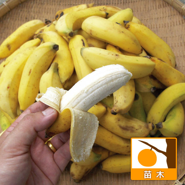 甘くほどよい酸味のおいしいバナナ果樹の苗/[26年4月下旬予約]バナナ:沖縄島バナナ3.5号ポット沖縄で古くから栽培されている一口サイズのバナナです。 バナナ特有の香りと甘さにほどよく酸味が効いて、食味がたいへん良い品種です。 メリクロン苗の利点としては、収穫時期がそろわない株分け苗と違い、一斉に収穫できる点が挙げられます。 タイプバショウ科バショウ属の非耐寒性常緑多年草草丈2.5〜3m生育適温18〜31度(最低気温5度まで)収穫までの年数1〜2年後から。 自家結実性日照日向むき用途鉢植え、庭植え栽培方法:水はけのよい土に植えてください。 酸性土壌ではpH5.5〜6.5に調整します。 鉢植えの場合は5号鉢程度に植え付け、成長に応じて徐々に大きな鉢に植え替えます。 5月から10月上旬までは戸外の日当たりのよい場所で管理します。 最低気温が15度以下になったら日照が十分ある室内で管理するか、温室に入れて保温してください。 厳寒期は室内であっても夜間にビニール袋やダンボールをかけ、最低気温が5度以下にならないようにしてください。 葉が35〜45枚出ると花芽を形成します。 根元から出てくる吸芽(下方の葉の付け根から出てくる芽)の1つを次の親株用に残して他の芽を摘み取り、果実を肥大させます。 6〜9月は3〜4日に1回、それ以外は週1回水やりします。 冬は乾燥気味に管理します。 一度結実した親株は枯れるので、収穫後に根元から切り取ります。 多肥を好むので、肥料は4月から10月の間月に1回与えます。 島バナナは着果後、低温にあうと果実にジャリ感が入り食味が著しく落ちるので、20〜30度を保つように温度管理します。 収穫は果実が十分に肥大して青いうちに行い、追熟させます。 お届けするのは3.5号(直径10.5cm)ポット入りの苗です。 お届け時の大きさには個体差があります。 写真、サイズと異なることがありますので、ご了承ください。 春先は幼苗期の寒さの影響で葉に多少傷みが見られる場合があります。 またお届け時期により葉焼けなどで葉がきれいでない状態の場合があります。 写真は成長時(結実時)のイメージです。 ■4月下旬頃のお届けの予約販売です。 ・注文締切日:2026年4月13日(月)午前7時・別々のご注文をおまとめすることはできません。 送料はそれぞれにかかります。 ・お届け日は4月14日以降にメールでご案内します。 お届け日指定はお受けできませんが、曜日・時間帯指定は承ります。 (受信できるアドレスでご注文ください)・品種によりお届け時期の変更や、お届けできなくなる場合があります。