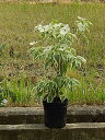 ヤマボウシ ウルフアイ葉に 斑入りの入る花木は夏には斑が消えてしまうものが多いのですが、この品種ヤマボウシ:ウルフアイは夏から秋もきれいな斑色を保ち、葉焼けも少ないカラーリーフ花木です。 花にも同じように美しい覆輪が入る おすすめのシンボルツリーです葉に美しい白覆輪の入るウルフアイは。 一般に斑入り花木は夏には斑が消えるものが多いのですが、この品種は夏から秋もきれいな斑色を保ち葉焼けも比較的少ない品種て゜す 。 花付きは他品種に比べると劣りますが、花にも同じように覆輪が入り、とても 珍しいお花です一般のハナミズキよりもわい性で、花ミズキと比較すると 樹高は少し低めで 樹形はきれいな開帳型となります。 半日陰の庭にふさわしい究極の庭木です。 ヤマボウシはもともとは日本の山野に自生していた、日本原産のハナミズキの1種です。 美しい樹形、清楚な花が庭木として根強い人気です。 花、実、紅葉が楽しめるのも、おすすめです 寒さに強く、比較的日陰にも強いので、北向きの玄関前などの建物まわりには最適ですが夏場の乾燥には弱いので、西日の強い場所はあまり適しません。 栽培適地:北海道南部以南 樹高:成木の樹高3m 開花期:5月 結実期:10月地植え 肥沃な土壌を好むので、植えつけ前に堆肥を入れて上げて下さい。 自然に樹形が整うので、剪定の必要はありません。 伸びすぎた芽や混みすぎた枝のみを剪定してください。 自家結実性があります。 成長は少し遅めで す。 秋には赤く色づいた実を収穫もできますもちろん 生でも食べられますが、ジャムにすると特に美味です。 お届けする苗は6号(直径18cm)ポット植え、樹高約60cmです。 樹高につきましては入荷時期により多少変動いたしますので、ご了承ください。 お届けする時期によりまして 樹姿が変わりますお届け時期によっては開花後となる 場合がございます。 また、夏以降は多少葉焼けがある場合がございますのでご了承ください。 冬季は落葉でのお届けとなります。 花色、葉色のバラエティも多彩で、秋の紅葉や赤い実も美しく、 四季折々の変化が楽しめる花木で お庭のシンボルツリーとして最適です。