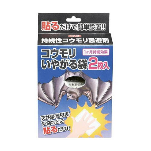 ●貼るだけ簡単設置。 ●ハーブの香りでコウモリの侵入を防ぎます。 ●天井裏・床下・侵入口・被害個所に設置するだけで効果があります。 ●主成分は天然香料を使用していますので、安全性が高く安心してお使いいただけます。 ●効果は約2週間〜1ヶ月間持続します。 (使用状況により異なります)●追い出しには同社スーパーコウモリジェットをお使い下さい。 ●本品は貼りつけることもできるタイプです。 ●貼りつける場所の塗装の状態によっては、塗装面を傷つけることがあります。 十分注意して設置してください。 ●シャッターに貼る場合は、本品が巻き込まれてしまわないよう注意してください。 ●天井裏や軒下などに1畳あたり2〜4個の割合でおいてください。 ●まとめて置かず間隔をあけて置いてください。 ●貼る場合は裏面のシールを剥がしてから設置してください。 ●そのまま置く場合は裏面を下にしてください。 ●手の届かない所に設置するときは紐をつけて投げると回収も簡単です。 ●姉妹品のスーパーコウモリジェット(コウモリ忌避スプレー)を併用すると効果が高まります。 スーパーコウモリジェットを使用する場合は本品を設置した後スプレーしてください。 ●内容量:2枚入り(50g*2)●商品サイズ:12.5cm*3.2cm*21cm●対象生物:コウモリ●コード番号:205655●事業者向け商品です。 リニューアルに伴い、パッケージ・内容等予告なく変更する場合がございます。 予めご了承ください。 広告文責:楽天グループ株式会社050-5212-8316 コウモリいやがる袋 2枚入 1,285 ~