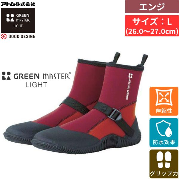 【商品説明】【特長】●オシャレで軽く、伸縮性のよい長靴です。 ●地下足袋感覚で履ける防水シューズです。 ●独自開発のグリップ底により、足場に跡が残りにくく、高いグリップ力を発揮します。 ●柔らかく脱ぎ履きのしやすいフィットタイプです。 【用途】●芝の管理・育成・メンテナンス●造園●ガーデニング●農作業●アウトドア●レジャーなど【仕様】●寸法(cm):26.0〜27.0●足幅サイズ:EEE●色:エンジ●靴丈(cm):18.0●靴丈(mm):186●履き口幅(mm):86●US(アメリカ)規格サイズ:85〜10●UK(イギリス)規格サイズ:75〜9●EU(ヨーロッパ)規格サイズ:41〜425【材質/仕上】●本体:SBR・ナイロン・ポリエステル・ポリウレタン●靴底・補強:天然ゴム・合成ゴム●バンド:ナイロン・プラスチック アトム 2622-E-L グリーンマスターライト エンジ L 4,677 ~