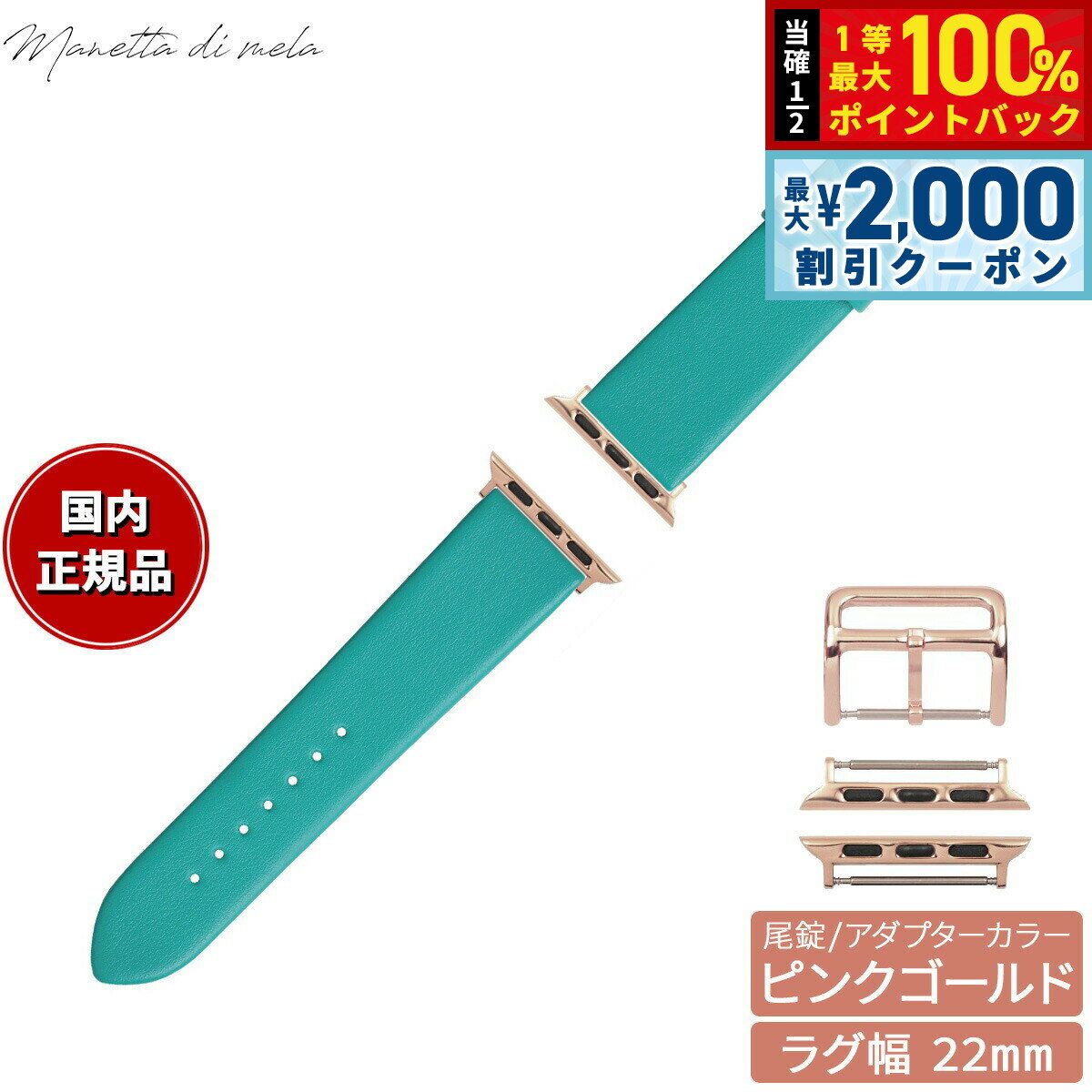【15日限定!2000円OFFクーポン&抽選で最大10000ptバック】マネッタ ディ メーラ Manetta di mela アップルウォッチ Apple Watch 替えバンド ベルト メンズ レディース トレソー イタリアレザー 22mm ターコイズ/ピンクゴールド EFA-TQ-P22 7,150 ~