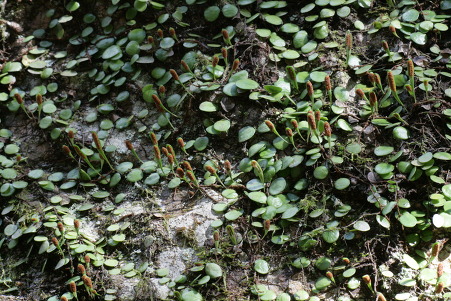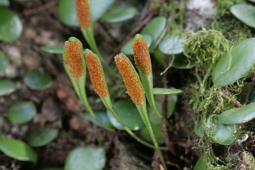 コメント:岩や木の上を這う小型のシダで高さ1cm程度。葉は長さ1cm程度で円形。胞子葉はへら形。
