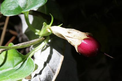 コメント:山地の木陰に生える多年草です。葉は対生、葉身は卵状披針形。薄紫色の花が葉の脇に咲きます。実は赤く熟します。