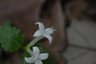 コメント:秋には小さな赤い実が山道に映える。花は初夏に2個づつ並んで開く。