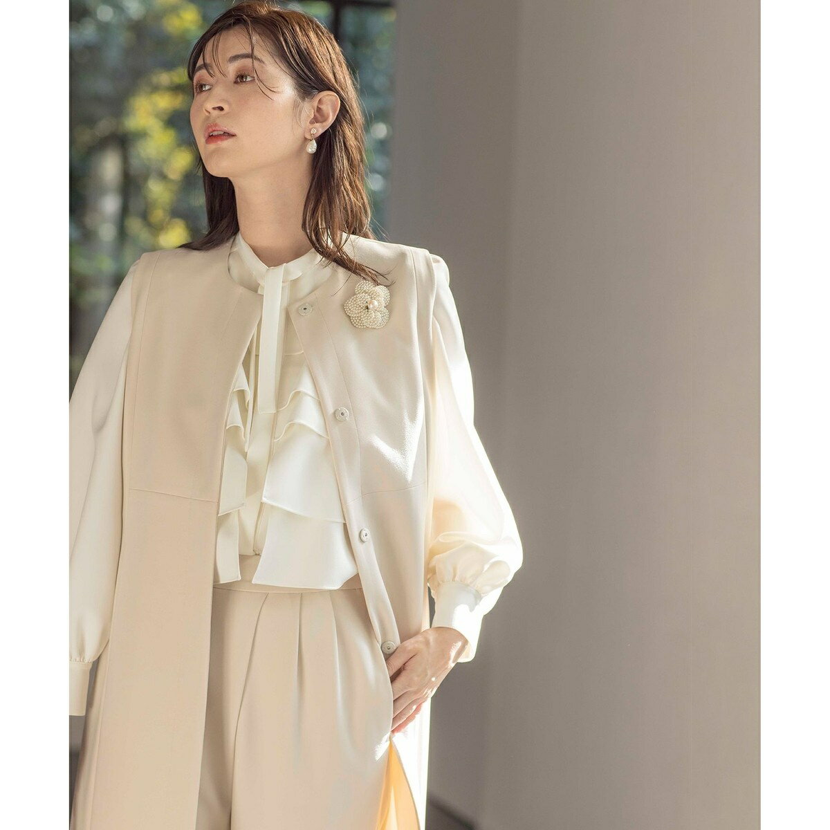 [型番:VRWLCS0801]■デザインパンツはもちろん、スカートスタイルにもしっかり合うバランスを目指して作ったジレは、着回し力抜群のアイテム。 Iラインのシルエットと素材の落ち着いた雰囲気が、大人の可愛らしさとリラックスムードを演出してくれます。 縦長ラインを強調した縦の切り替えや襟元のカッティングで洗練された女性らしさをプラスし、スタイルアップ効果も。 スタイリングによって綺麗めからカジュアルまで雰囲気をかえられます。 きちんと感がありながらも抜け感のあるコーデが完成するジレは、コンサバすぎるのは自分らしくないという方におススメです。 ■素材糸を撚糸することで生まれる素材の繊細な表面感は、光沢とマットさが絶妙で、着用すると女性らしいやわらかさと上品な印象を与えてくれます。 落ち感はありつつも、もたつき感がなく適度なハリ感がある二重織の素材です。 縦横に伸びる素材なので着心地が良く透けすぎません。 また、ハリとコシがあるため重たさは感じにくいです。 素材の肉感が適度に体形をカバーしてくれるのも嬉しいポイント。 シーズンレス・シーンレスな素材感も特徴です。 ※商品画像はサンプルを使用しているため、実際にお届けする商品と色味やサイズ等の仕様に変更がある場合がございます。 予めご了承ください。 【お買い物をより楽しんで頂くために】▼商品のお気に入り登録ハートマークをクリックし、お好きなカラーを選んでお気に入りに登録が完了!完売カラーの再入荷通知や、ラスト1点の通知、セールの通知も受け取ることができます。 ▼ブランドのお気に入り登録新商品や再入荷等、いち早くブランドのお得な情報を受け取ることができます。 ※他のキャンペーンにより、期間中に価格が変動する場合があります。 ※セールは予告なく終了させていただく場合もあります。 ■カラー:アイボリー系、ネイビー系6:着丈94.0 身幅55.5※( )で表記されている数字はヌードサイズです。 ヌードサイズとは衣服を身につけない身体のサイズです。 お客様ご自身の身体サイズと比較してお選びください。 ■素材: [表地]ポリエステル:87%,ポリウレタン:13%[裏地]ポリエステル:100% ■お手入: 手洗い、酸素系漂白剤可、タンブル乾燥不可、自然乾燥、アイロン仕上げ可、ドライ、ウエットクリーニング可 >>商品のお取り扱い方法 ■原産国: 中国【KUMIKYOKU NAVY】コンフォータブルドレープ ジレ/組曲(KUMIKYOKU)アイボリー系ネイビー系画面上と実物では、多少色具合が異なって見える場合がございます。