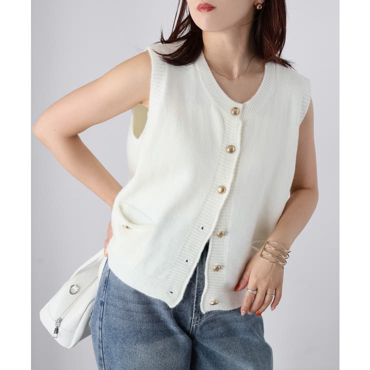 【Riberry 金ボタンノースリーブニットベスト】\マットな質感のニュアンスボタンがポイント!/1枚着でもレイヤードでもバランス良く決まるニットベスト♪■Stylingクラシカルなムード漂う、金ボタンデザインのニットベストが登場しました。 シンプルなシルエットに映えるゴールドボタンがポイントになり、コーディネートをぐっと華やかに見せてくれる一枚。 すっきりとしたクルーネックとコンパクトな丈感で、バランスよく着られるデザインに仕上げました。 さりげないポケットディテールもアクセントとなり、大人可愛い雰囲気を演出。 一枚でトップス風にに着るのはもちろん、ニットジレ風にシャツやブラウスと重ねればトレンド感のあるきれいめスタイルに、ロンTやカットソーと合わせればデイリーに着まわせます♪ボトムはデニムやフレアパンツでカジュアルに、プリーツスカートと合わせれば女性らしく華やかな印象に◎カラーは、着回し力抜群の《グレー》《アイボリー》《ブラック》に加え、コーデの差し色になる《レッド》の4色展開。 ベーシックからアクセントまで幅広く楽しめる、ワードローブに加えたい一着です!■Detail程よくゆとりを持たせたシルエットで、体のラインを拾いすぎずリラックスした着心地を実現しました。 袖はフレンチスリーブに近いノースリーブデザインで肩回りを露出しすぎず、すっきり見えするのが嬉しいポイント◎襟ぐりや裾、アームホールにはしっかりとしたリブ編みを施し、きちんと感をキープしつつ着崩れしにくいデザインに仕上げました。 ■Materialアクリル、ポリエステル、ナイロンを混紡した柔らかなニット生地。 モチモチとした肌触りでチクチク感がなく、ストレスフリーな素材です!程よい肉感のニット素材は、インナー次第でロングシーズン活躍します♪▽生地感透け感:あり 〇〇●〇〇なし(アイボリーややあり)生地の厚さ:厚い 〇〇●〇〇 薄い裏地:なし伸縮性:あり※商品の梱包には細心の注意を払っていますが、通販の特性上、到着時に畳みシワがついている可能性がございます。 予めご了承ください※この素材は摩擦(特に湿った状態での摩擦)や雨、汗でぬれた際には他の衣料等に色が移ることがございますのでご注意ください。 ※お肌のデリケートな方は刺激を感じる場合がございます。 ※詳しいお手入れ方法は商品タグをご参照ください。 【Information】◆《お気に入り登録》がオススメ◆・「商品のお気に入り登録」で再入荷通知や、ラストの通知、セール通知も受け取ることが出来ます。 ・「ブランドのお気に入り登録」で新商品や再入荷など、お得な情報を受け取ることが出来ます※撮影時のライティング、ご覧になっているモニター・PC環境により、実際の商品と色味が異なって見える場合がございます。 予めご了承をお願い致します。 返品・交換について購入後の交換は受け付けておりません。 予めご了承ください。 返品を希望される場合は購入履歴一覧の「ショップへの問い合わせ」よりお問い合わせください。 =========================複数配送先指定について1件の注文に対して、異なる住所への配送は対応出来かねます。 恐れ入りますが、異なる住所へ配送をご希望の場合、配送先毎に分けて注文いただきますようお願い申し上げます。 【トップスWOMEN】アイボリー グレー ブラック レッド FREE アクリル42%, ポリエステル30%, ナイロン28%アイボリー グレー ブラック レッド 【10%OFFクーポン!1/16(金)1:59まで】Riberry 金ボタンノースリーブニットベスト トップス 5,500 ~