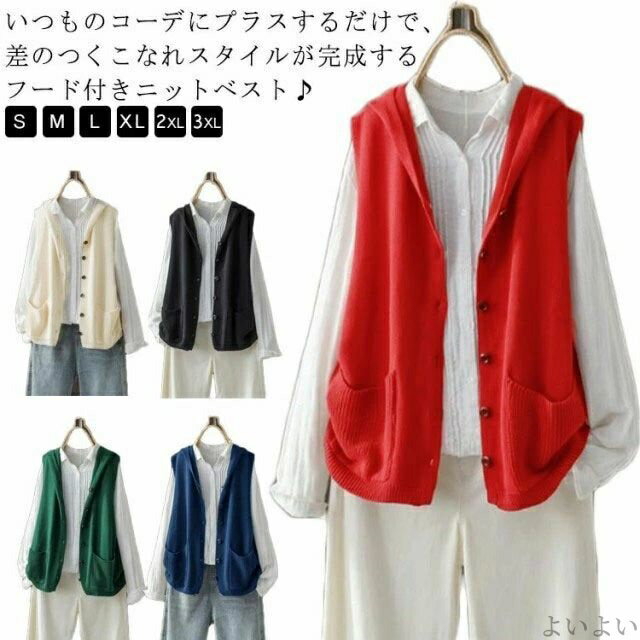 いつものコーデにプラスするだけで、差のつくこなれスタイルが完成するフード付きニットベスト♪計算されたゆったりラフなシルエットが魅力。 たっぷりとしたフードデザインが抜け感のある大人カジュアルな印象に◎心地良い肌触りのニット生地を使用。 程良い厚みでロングシーズン活躍する素材感です。 カットソーやタートルネック、ハイネックとも相性が良く幅広い着こなしが楽しめます。 インナートップスやワンピース等のレイヤードスタイルにも合わせやすい1枚です。 サイズS M L XL 2XL 3XLサイズについての説明S:着丈57cm 肩幅36cm 体重40-45kg/ M:着丈58cm 肩幅36cm 体重45-50kg/ L:着丈59cm 肩幅37cm 体重50-55kg/ XL:着丈60cm 肩幅37cm 体重55-60kg/ 2XL:着丈61cm 肩幅38cm 体重60-70kg/ 3XL:着丈62cm 肩幅38cm 体重70-80kg/ ※サイズ表の実寸法は商品によって1-3cm程度の誤差がある場合がございます。 素材ポリエステル色レッド グリーン ベージュ ブラック ネイビー備考 ●サイズ詳細等の測り方はスタッフ間で統一、徹底はしておりますが、実寸は商品によって若干の誤差(1cm〜3cm )がある場合がございますので、予めご了承ください。 ●商品の色は、撮影時の光や、お客様のモニターの色具合などにより、実際の商品と異なる場合がございます。 あらかじめ、ご了承ください。 ●製品によっては、生地の特性上、洗濯時に縮む場合がございますので洗濯時はご注意下さいませ。 ▼色味の強い製品によっては他の衣類などに色移りする場合もございますので、速やかに(脱水、乾燥等)するようにお願いいたします。 ▼生地によっては摩擦や汗、雨などで濡れた時は、他の製品に移染する恐れがございますので、着用の際はご注意下さい。 ▼生地の特性上、やや匂いが強く感じられるものもございます。 数日のご使用や陰干しなどで気になる匂いはほとんど感じられなくなります。