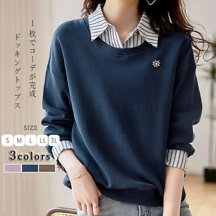 【SS10%OFF】トップス 切替え トレーナー スウェット プルオーバー コットン レディース レイヤード風 ドッキング 付け襟 長袖 ストライプ ゆったり カジュアル 無地 春 秋 冬 S M L 2L 3L 2,950 ~