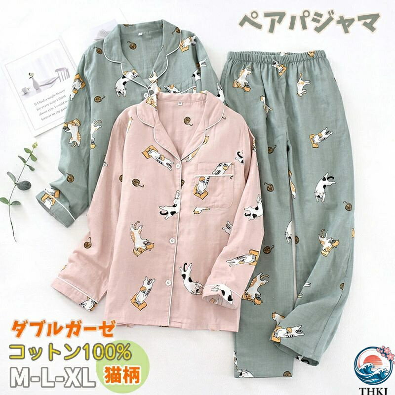 【全品2点で5%OFF】トップス ダブルガーせ 春秋 カップル カップルパジャマ レディース 猫柄 上下セット おしゃれ 肌着 パジャマ 前開き 母の日 敬老の日 ルームウェア セットアップ 寝間着 ペアパジャマ 部屋着 ギフト ナイトウェア 前開き 綿100% パンツ メンズ 長袖 3,330 ~