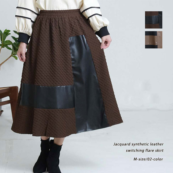 レディース ファッション Buzz-ex 新品 コンビニ受け取り 新作 プチプラ ぷちぷら ワンピース バッグ アクセサリー トレンド 春 夏 秋 冬 新作毎日★合皮のポイント使いが目を惹くフレアスカート★ 凹凸感が特徴的なふくれジャガード生地に合皮レザーをオン。 部分使いの切り替えパターンがおしゃれなスカート。 コーデに取り入れるだけで、モードな印象の主役級アイテムです。 大人女子にも着こなしやすい膝下のミディアム丈で、 裾に向かって緩やかな広がりをみせるフレアシルエット。 レッグラインを拾いにくいので、さりげなく体型カバー効果も。 ウエストはゴム仕様で締め付けを感じにくく、 ストレスフリーの穿き心地です。 サイズはMのみのワンサイズ。 ブラウン/ブラックの2カラー展開です。 商品の詳細 サイズ(メーカー記載より) Mサイズ 着丈…約78cm ウエスト幅(ゴム仕様)…約31cm〜 素材 表地/ポリエステル 100% 別布/ポリウレタン 55% ポリエステル 45% 裏地/ポリエステル 100% 伸縮性|□あり □若干あり ■なし 裏 地|■あり □なし 透け感|□あり □多少あり ■なし 着用モデルデータ モデルサイズ|身長…165cm 生産国 中国 ※ご注意※ ●屋外にて撮影した写真は、実物と色合いが 異なって見える場合もございます。 商品の写真は実物の色に近づけるため、 加工している場合もございます。 ●安価でのご提供のため、細部にわたり若干縫製の 乱れなどがある場合がございます。 また、商品の特性上、生地の取り位置により、 柄の出方やニュアンスなど、多少の個体差が生じ 画像と表情が異なることがございます。 ●柄の縫い合わせが揃っていないことがございます。 また、総柄商品におきましては、生地の取り方により、 柄の位置や向きが商品画像と異なる場合がございます。 予めご了承の上、お買い上げ下さいますよう よろしくお願い申し上げます。 ●お客様がお使いのモニターによっては 色の見え方に違いが生じる場合がございます。 予めご了承の上、ご確認をお願い申し上げます。 ●素材・染料の性質上、色落ちする場合がございます。 なるべく他の物とは分けて洗い、漂白剤のご使用はお避け下さい。 また、タンブラー乾燥のご使用はお避け下さい。 お洗濯後は濡れたまま放置しないで下さい。 お洗濯の際にはネットのご使用をお勧め致します。