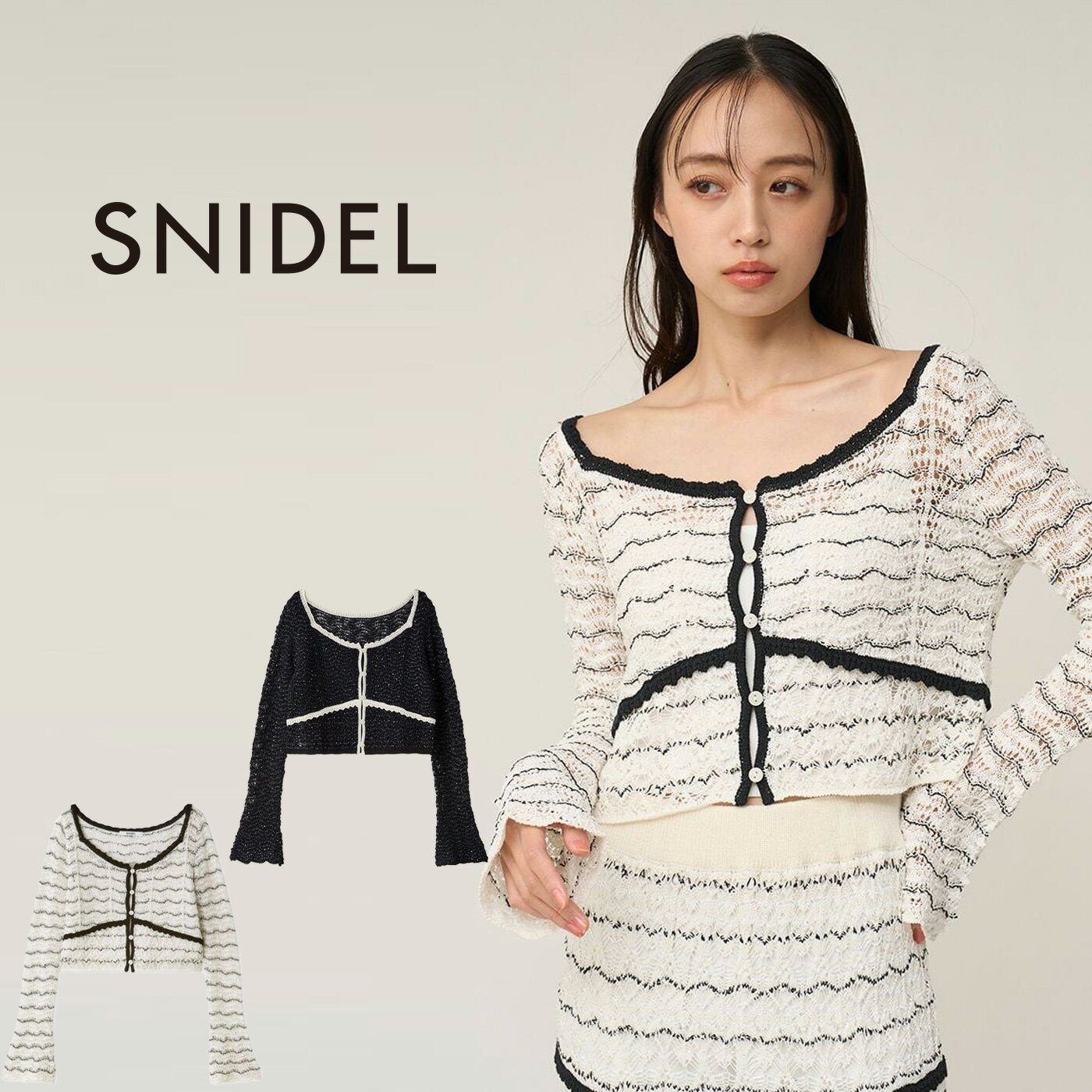 SNIDEL スナイデル 通販 クロシェニットトップス swnt261156 レディース カーディガン 羽織り 透け感 キャミソール付き セレクトショップムー 【商品キーワード】 ★Snidel トップス★ メーカー希望小売価格はメーカー商品タグに基づいて掲載しています2026/03/01 更新 SNIDEL (スナイデル) クロシェニットトップス swnt261156 ■素 材■ 本体:綿44%、レーヨン31%、ポリエステル17%、リネン8%/ハ゜イヒ゜ンク゛:レーヨン46%、綿34%、ポリエステル11%、リネン9% キャミソール:ポリエステル ■サイズ■ FREE:着丈36.5cm バスト81cm 袖丈55.5cm 肩幅33cm 前下がり10.5cm 裾幅38cm 【サイズ備考】 【インナー】総丈:34cm,バスト:76cm,裾幅:44cm ※サイズ表記について商品によって同サイズや同色等であっても各商品毎に誤差がある為、 サイズ表記はあくまでも目安としてご参照ください。 ■ 色 ■ NVY(ネイビー) BORDER(ボーダー) ■詳 細■ 【様々な素材を組み合わせた華やかな糸でお作りした華やかなクロシェニットトップス】 【Design/Styling】 コットンやキラキラと輝くスパンコール糸を撚り合わせた華やかな糸を使用した、クロシェニットカーディガンが届きました。 横に流れるような繊細な柄編みと、襟ぐりや前立ての配色使いが上品です。 フロントのボタンを閉めてトップスとしてのご着用もおすすめ。 襟ぐりを大きく開けたスクエアネックが女性らしさを引き立てます。 キレイめなボトムに合わせたり、デニムに合わせてカジュアルダウンスタイルもおすすめです。 クロシェニットスカート(SWNS261255)と同じ編地でお作りしており、セットアップでもご着用いただけます。 インナーキャミソール付きなので安心してご着用いただけます。 【Fabric】 今季トレンドカラーのマリンな雰囲気のネイビー、ホワイト生地にブラックのラメ糸でボーダー風に仕上げたボーダー。 透け感:あり 裏地:インナー付属 伸縮性:あり 光沢感:ややあり 生地の厚さ:やや薄手 【おすすめ骨格タイプ】 ■骨格ストレート ■骨格ウェーブ ■骨格ナチュラル ※照明の関係により、実際よりも色味が違って見える場合があります。 またパソコン・スマートフォンなどの環境により、若干製品と画像のカラーが異なる場合もございます。 予めご了承ください。 商品の色味は、商品単品画像をご参照下さい。 ※商品画像はサンプルのため、色味やサイズ等の仕様に変更がある場合がございますので、予めご了承ください。 ■他にも■ 【SNIDEL】の商品一覧はコチラ 【トップス】アイテム一覧はコチラ 【ニット】アイテム一覧はコチラ 【ギフトラッピング】はコチラ スナイデル SNIDEL クロシェニットトップス swnt261156 レディース カーディガン 柄編み 透け感 インナー付き 2026春 セレクトショップムー 12,650 ~