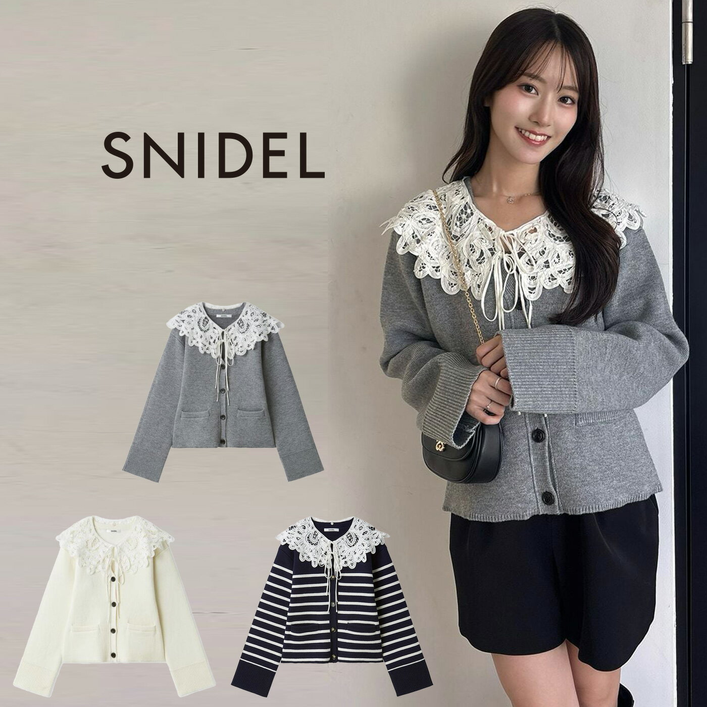 SNIDEL スナイデル 通販 バテンレースカラーニットカーディガン swnt261204 レディース ニット トップス 襟付き 上品 エレガント セレクトショップムー 【商品キーワード】 ★Snidel ニット★ メーカー希望小売価格はメーカー商品タグに基づいて掲載しています類似商品はこちらスナイデル SNIDEL エンブロイダリーカラ19,800円スナイデル SNIDEL モチーフレースニット17,930円スナイデル SNIDEL プリーツフリルニット13,970円2026/03/02 更新 SNIDEL (スナイデル) バテンレースカラーニットカーディガン swnt261204 ■素 材■ 本体:【OWHT/GRY】表側ポリエステル44%、羊毛22%、アクリル19%、ナイロン15%/裏側レーヨン51%、ポリエステル30%、ナイロン19% 接結糸ポリエステル100%/【BORDER】表側ポリエステル44%、羊毛20%、アクリル20%、ナイロン16% 裏側レーヨン50%、ポリエステル31%、ナイロン19%/接結糸ポリエステル100% 付け衿:綿100% ■サイズ■ FREE:着丈:54cm バスト:95cm 袖丈:54cm 肩幅:43.5cm 前下がり:20cm 裾幅:45cm ※サイズ表記について商品によって同サイズや同色等であっても各商品毎に誤差がある為、 サイズ表記はあくまでも目安としてご参照ください。 ■ 色 ■ GRY(グレー) BORDER(ボーダー) OWHT(オフホワイト) ■詳 細■ 【取り外し可能なコットンバテンレースカラーがフェミニンなニットカーディガン】 【Design/Styling】 ヴィンテージのエッセンスを感じさせるバテンレース襟の図案が、華やかでエレガントなニットカーディガンです。 大きめのセーラー風のホワイトレース襟が、顔まわりや後ろ姿を優しく彩ります。 襟は取り外しが可能。 後ろ首元のボタンで取り外しができるデザインです。 襟のフロントの2本の細紐はリボン結びをしても、そのまま垂らして動きを出してアレンジしていただいても可愛いです。 身頃も袖も程よくゆったりとしたデザインで抜け感を出しました。 ボタンを全て留めて、ニットトップスとしてのご着用もおすすめ。 爽やかなホワイトの襟が、コーディネートを品よく見せてくれます。 【Fabric】 エレガントなオフホワイト、明るい色味のグレー、ネイビーとホワイトのマリンな雰囲気のボーダーの3色展開です。 もちもちとした肉厚なウール混合のニット生地を使用。 襟はコットン素材です。 ポケット付き。 【おすすめ骨格タイプ】 ■骨格ストレート ■骨格ナチュラル ※照明の関係により、実際よりも色味が違って見える場合があります。 またパソコン・スマートフォンなどの環境により、若干製品と画像のカラーが異なる場合もございます。 予めご了承ください。 商品の色味は、商品単品画像をご参照下さい。 ※商品画像はサンプルのため、色味やサイズ等の仕様に変更がある場合がございますので、予めご了承ください。 ■他にも■ 【SNIDEL】の商品一覧はコチラ 【ニット】アイテム一覧はコチラ 【カーディガン】アイテム一覧はコチラ 【ギフトラッピング】はコチラ スナイデル SNIDEL バテンレースカラーニットカーディガン swnt261204 レディース ニット トップス 襟付き 上品 エレガント 2026春 セレクトショップムー【P10】 18,920 ~