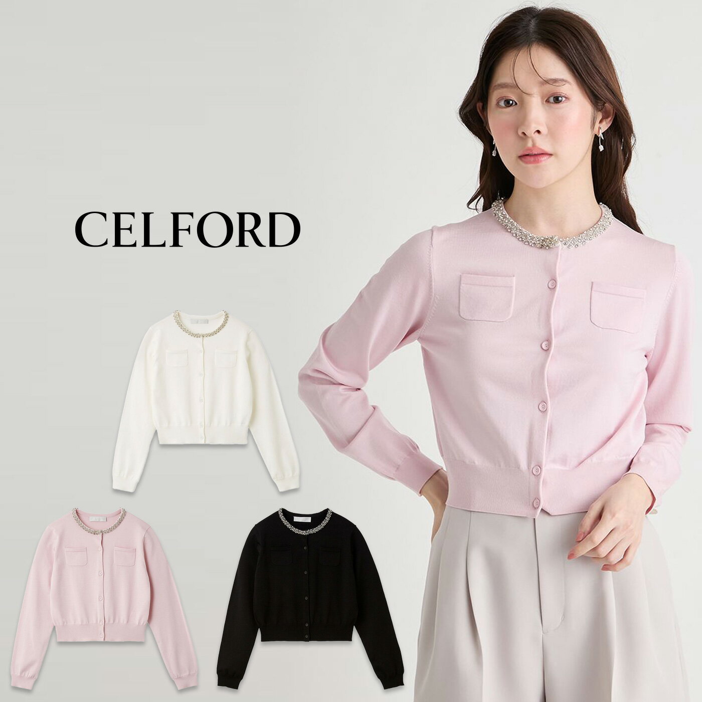 CELFORD セルフォード 通販 UVカット シルクブレンドビジューネックカーディガン cwnd261119 レディース トップス コンパクト 光沢 上品 セレクトショップムー 類似商品はこちらセルフォード CELFORD スクエアネックラ16,500円セルフォードCELFORD ペタルビジューカー20,900円セルフォード CELFORD デタッチャブルリ19,800円2026/03/02 更新 CELFORD セルフォード UVカット シルクブレンドビジューネックカーディガン cwnd261119 ■素 材■ 本体:ポリエステル58%、レーヨン36%、シルク6% ■サイズ■ FREE : 着丈:45cm,バスト:86cm,袖丈:56.5cm,肩幅:34cm,前下がり:8cm,裾幅:35cm ※サイズ表記について商品によって同サイズや同色等であっても各商品毎に誤差がある為、 サイズ表記はあくまでも目安としてご参照ください。 ■ 色 ■ OWHT(オフホワイト) LPNK(ライトピンク) BLK(ブラック) ■詳 細■ シルクの光沢感と衿元のビジューが美しいクルーネックカーディガン。 軽く、シルク混の艶やかな風合いが上品でありながら、胸ポケットを付けることでキャッチーな印象に仕上げました。 昨年よりもコンパクトなシルエットで、ボトムスとのバランスが取りやすい丈感にしています。 デニムなどカジュアルなボトムスと合わせても、きちんと感のある印象をあたえてくれるアイテムです。 【おすすめ骨格タイプ】 ■骨格ウェーブ 透け感:なし 裏地:なし 伸縮性:あり 光沢感:あり 生地の厚さ:薄手 ※照明の関係により、実際よりも色味が違って見える場合があります。 またパソコン・スマートフォンなどの環境により、若干製品と画像のカラーが異なる場合もございます。 予めご了承ください。 商品の色味は、商品単品画像をご参照下さい。 ※商品画像はサンプルのため、色味やサイズ等の仕様に変更がある場合がございますので、予めご了承ください。 【洗濯表記】 洗濯表示の詳しい説明はコチラ ■他にも■ 【CELFORD】の商品一覧はコチラ 【カーディガン】アイテム一覧はコチラ 【ギフトラッピング】はコチラ セルフォード CELFORD UVカット シルクブレンドビジューネックカーディガン cwnd261119 レディース トップス コンパクト 光沢 上品 2026春 セレクトショップムー【P10】 18,700 ~