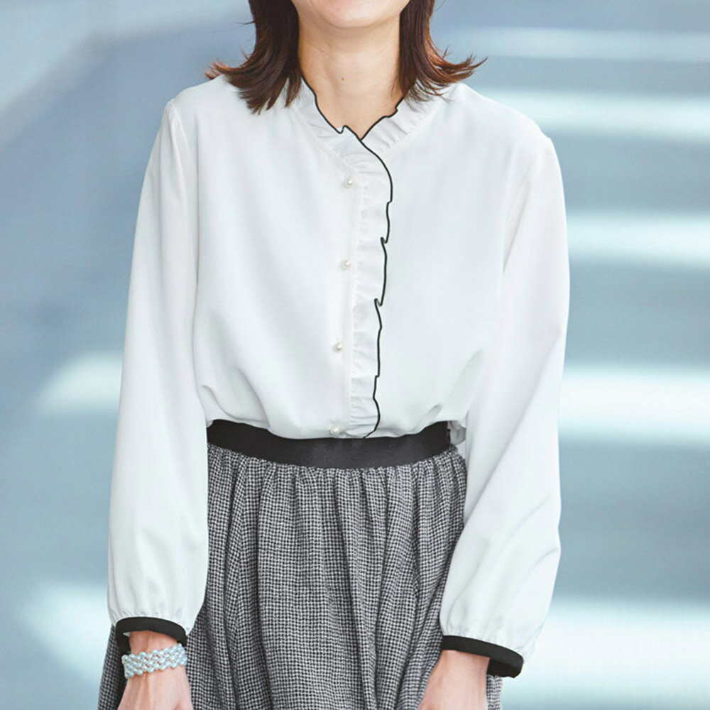 Dramatic blouse纏うだけで華やかさが加速する主役級アイテムをスタンバイオフホワイトをベースに、フリル端のメロウ始末をブラックにし引き締めています。 パール調ボタンを前にしてブラウス風、後ろにしてプルオーバー風と、前後2ウェイで着用可能。 寒い時期は上にニットを合わせて、襟からフリルをのぞかせる着こなしもおすすめです。 ページ下部に画像の説明がございます。 一部別売りの商品もございますので、説明文ご確認のうえご注文ください。 >画像の説明はこちら<仕様・サイズ■色:オフホワイト×ブラック■素材:ポリエステル100%■前(後ろ)中心ボタン開き■袖口細カフス仕立てボタン開き■両脇裾スリット有り■前後2ウェイ仕様■原産国:中国製■透けやすい素材の為、インナーの着用をお薦めします。 ◆サイズ(cm)【S】バスト(適応) 72着丈 65ゆき丈 72.5スリット長さ(脇) 8【M】バスト(適応) 79着丈 65ゆき丈 74スリット長さ(脇) 8【L】バスト(適応) 86着丈 67ゆき丈 75.5スリット長さ(脇) 8【LL】バスト(適応) 93着丈 67ゆき丈 77スリット長さ(脇) 8【送料マーク:A】 この商品の販売価格には配送料880円(税込)が含まれています。 画像の説明前後2WAY前後2WAY2Way style ボタン面 コーディネート例2Way style タック面 コーディネート例コーディネート例コーディネート例コーディネート例エレガントさを加速させる前立てと袖口のパールボタンがポイント。 【クーポン最大5千円OFF 1/13迄】 前後2ウェイ 配色メロウフリルブラウス ブラウス シャツ PC6344 13,780 ~
