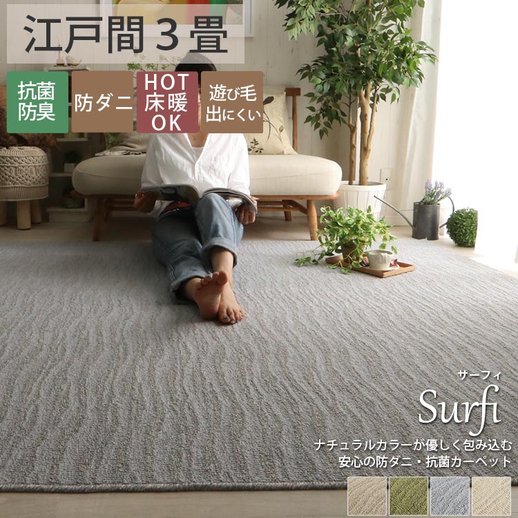 波うつ模様とナチュラルカラーがオシャレ安心安全の日本製 遊び毛が出にくく、防ダニ・抗菌機能あり服を気にせずリラックスできます。 【アイボリー】 織りに長短をつけることで模様を表現しています。 さらりとした触り心地。 防ダニ・抗菌機能もついて安心。 遊び毛が出にくいのでコロコロでのお手入れが簡単。 縁は丁寧にロック加工されています。 全厚約7mm。 程よい薄さで一年中快適に過ごせます。 裏面は不織布貼り。 床暖房・ホットカーペット対応。 【ベージュ】 【グリーン】 【グレー】 カラーラインナップ 【アイボリー】 【ベージュ】 【グリーン】 【グレー】 サイズラインナップ 江戸間サイズ 約176x261cm 江戸間3畳¥13,200 約261x261cm 江戸間4.5畳¥19,800 約261x352cm 江戸間6畳¥26,400 約352x352cm 江戸間8畳¥35,200 約352x440cm 江戸間10畳¥44,000 約352x522cm 江戸間12畳¥52,800 本間サイズ 約191x286cm 本間3畳¥15,600 約286x286cm 本間4.5畳¥23,400 約286x382cm 本間6畳¥31,200 約382x382cm 本間8畳¥41,600 約382x477cm 本間10畳¥52,000 約382x572cm 本間12畳¥57,800 商品機能 商品詳細 品名 サーフィ 素材 ポリエステル55%、ポリプロピレン45% 裏面 不織布 パイル長 約5.5/2.5mm 生産国 日本 梱包 丸巻き 注意 ※ご覧のモニターの環境、撮影環境により実物と色味が異なって見える場合が御座います。 ※デザインの特性上、柄向きの指定はできません。