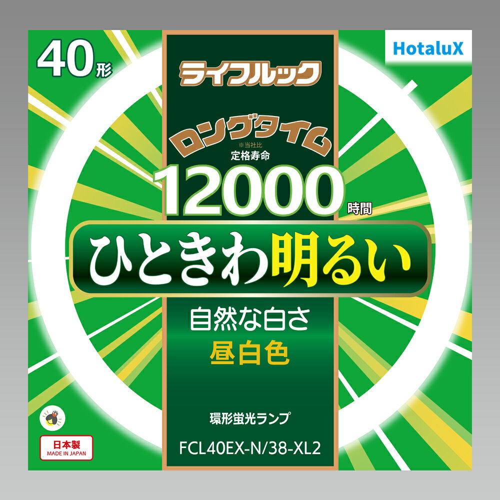 【返品種別A】□「返品種別」について詳しくはこちら□高演色で色鮮やか、ひときわ明るい、ホタルクスの3波長形蛍光ランプ◆ロングタイム 定格寿命12000時間※メーカー比率◆ひときわ明るい自然な白さ、昼白色◆太陽の輝きに近づきました太陽の光がつくり出す自然な輝きに照らされた色彩は、とてもきれいでキメこまやかです。 ライフルックは、この太陽の光に近い輝きで、生活を美しく演出するあかりです。 ◆色彩が自然に見えますライフルックは、新蛍光体を加えてつくり出された新しいランプです。 3波長蛍光体により演色性が良く、果物や野菜などの自然色を引きたてます。 ◆こだわりの色いろいろ黄色っぽく見える白、黒っぽく見える赤色は、光の性質によるものです。 ライフルックは、白を澄み切った純白に、赤を鮮やかな赤色に際立たせます。 白を白らしく、赤を赤らしく演出することの他、肌の色が健康的で素敵な肌色に映えて見えます。 ◆ハイグレードスーパーフィルターライフルックは、メーカー独自の技術であるハイグレードスーパーフィルターを採用することにより、ガラス管の劣化を抑えます。 また、点灯時間に対する光束現象も改善することができます。 ■ 仕 様 ■種別:40形光色:3波長形昼白色(5000K)口金:G10q寸法:管径29、外径373mm質量:260g定格ランプ電力:38Wランプ電流:0.425A全光束:3370lmエネルギー消費効率:88.6lm/W定格寿命:12000時間適合点灯管:FG-4P[FCL40EXN38XL2]HotaluX生活家電>電球・管球>丸型蛍光灯(FCL器具専用)>40形 ホタルクス 40形丸型蛍光灯・昼白色 FCL40EX-N/38-XL2 HotaluX ライフルック [FCL40EXN38XL2] 2,420 ~