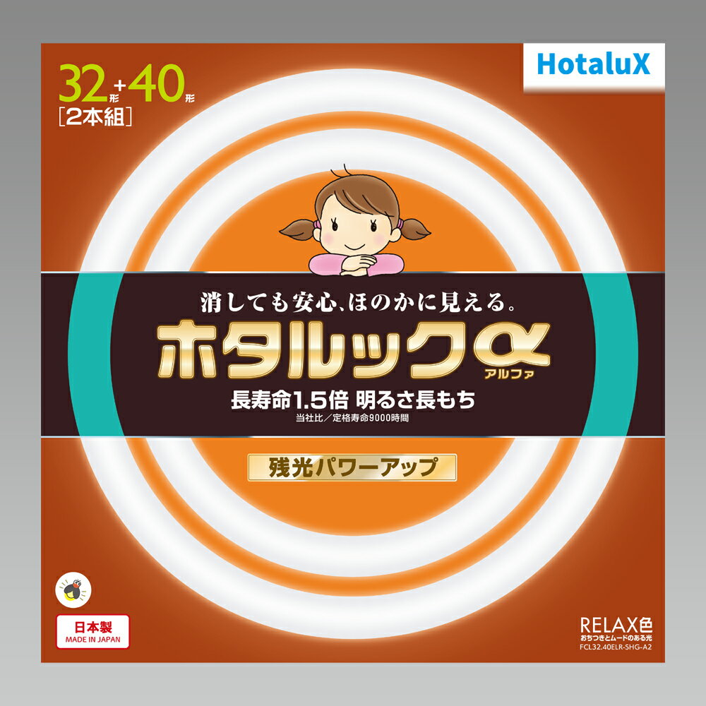 【返品種別A】□「返品種別」について詳しくはこちら□◆消しても安心。 ほのかに見える。 ホタルックα(アルファ)消灯後の残光効果25%アップ(※)。 はっきり・長持ち、安心。 残光。 3波長蛍光ランプ※メーカー従来品比◆おちつきとムードのある光、RELAX色◆より長く安心が続くようになりました。 ホタルック蛍光体を増量して、突然の停電等でもより長く安心を感じていただけます。 ◆ホタルックはこんな時でも安心です。 布団にはいるまで、ぶつからない、つまづかない。 寝顔も、しっかり見えて安心。 急な停電でも、あわてない、あせらせない。 ランプが割れても、光るので、破片を踏まない。 ◆長寿命1.5倍「αトリプルコイル」の採用で9000時間の長寿命(※)を実現。 ※メーカー旧モデル比◆明るさ長もち蛍光ランプは、ご使用になっている間明るさが徐々に低下していきます。 メーカ従来品のホタルックは、6000時間経過で初期の明るさの70%※まで落ちてしまいます。 ホタルックαは、「α蛍光体」に「α保護膜」を加えた蛍光ランプの3層コーティングにより、ガラス管及び蛍光体の紫外線による劣化を抑え、残光効果を維持しながら、9000時間経過後でも初期の明るさ約80%を維持します。 ※JIS規格では、全光束が初期値の約70%に下がるまでを寿命のひとつに定義しています。 ◆使用用途一般家庭(リビングルーム、寝室、和室、子供部屋、書斎など)■ 仕 様 ■■FCL32ELR/30-SHG-A2種別:32形光色:3波長形RELAX色(電球色、2700K)口金:G10q寸法:管径29、外径299mm質量:210g定格ランプ電力:30Wランプ電流:0.425A全光束:2320lmエネルギー消費効率:77.3lm/W定格寿命:9000時間適合点灯管:FG-5P■:FCL40ELR/38-SHG-A2種別:40形光色:3波長形RELAX色(電球色、2700K)口金:G10q寸法:管径29、外径373mm質量:260g定格ランプ電力:38Wランプ電流:0.425A全光束:3100lmエネルギー消費効率:81.5lm/W定格寿命:9000時間適合点灯管:FG-4P[FCL3240ELRSHGA2]HotaluX生活家電>電球・管球>丸型蛍光灯(FCL器具専用)>セット(32形・40形) HotaluX 32形+40形丸型蛍光灯・RELAX色(電球) FCL32.40ELR-SHG-A2 HotaluX ホタルックα [FCL3240ELRSHGA2] 3,310 ~