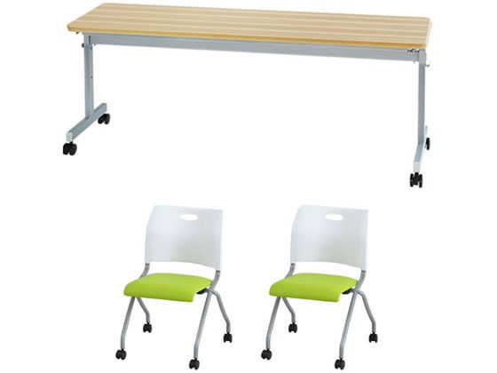 【商品説明】【テーブル】厚さ30mmのしっかりした作りでありながら、移動のしやすい重量を実現しました。 操作感の軽いレバーで片手でらくらくと折りたたむことができ、スタッキング収納可能です。 【チェア】ほどよい弾力のソフトな座面のミーティングチェアです。 使わない時は平行スタッキングでコンパクトに収納が可能。 軽量でキャスター付き、背もたれには取っ手もついているので、設置や片付けもラクラクです。 【仕様】●フォールディングテーブル1台+RAPネスティングチェア2脚 セット●外寸/テーブル:幅1800×奥行450×高さ700mm/チェア:約幅540×奥行600×高さ770(座面高430)mm(1脚あたり)●カラー/テーブル:シルバーフレーム×ナチュラル天板/チェア:背ホワイト×座面グリーン●材質/テーブル:天板/メラミン樹脂化粧板、エッジ/PVC貼り、脚/スチール(粉体塗装)、キャスター/ナイロン/チェア:背座/ポリプロピレン、張地/PVCレザー(塩化ビニール)、ウレタンフォーム、フレーム/スチール(粉体塗装)、キャスター/ナイロン●機能/テーブル:中棚付き/チェア:キャスター付き●重量/テーブル:21.4kg/チェア:約5kg(1脚あたり)●梱包重量/テーブル:23.6kg/チェア:約8kg(1脚あたり)●セット内容/テーブル(GLF−1845−FW)×1台/チェア(Rap−NC−FW)×2脚●組立品●保証期間:1年【別途送料について】沖縄・離島・一部北海道や山間部へのお届けの場合、別途送料の発生、もしくはお届けができない場合がございます。 別途送料が発生する場合、ご注文後、翌営業日中にご案内いたします。 ※こちらの商品は、個人宅の配送は行っておりません。 お届け先が個人名様の場合、キャンセルとさせていただきます。 お届け先が法人の場合、必ずお届け先に会社名をご記載ください。 ※原則、軒先(玄関先)渡しとなります。 階上、階下となる場合、またエレベーターのご使用ができない場合、段差があるなど、納品場所の状況によりましては1階軒先でのお渡しとなります。 【お届け日・時間指定について】お届け日・時間の指定は承れません。 【備考】※メーカーの都合により、パッケージ・仕様等は予告なく変更になる場合がございます。 【検索用キーワード】Netforce ネットフォース ねっとふぉーす テーブル1台+チェア2脚セット幅1800mmSNWHG フリーアドレスデスク ミーティングチェア オフィスチェア 幅1800×奥行450×高さ700mm ナチュラル×ホワイト グリーン ナチュラル ホワイト GLF−1845−Rap−NC2−FW−NAWG GLF1845RapNC2FWNAWG テーブル1台 チェア2脚 セット フォールディングテーブル RAPネスティングチェア テーブルキャスター付き チェアキャスター付き 塾 会議室 会社 セミナールーム 学校 施設 会議用テーブル 長机 フリーアドレス 省スペース フォールディングテーブル 1セット 会議用テーブル 長机 ミーティングテーブル R232MD会議用テーブルとミーティングチェアのセットです。
