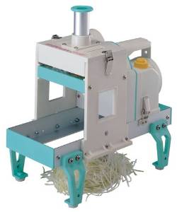 メーカー 千葉工業所 商品カテゴリ 調理器具>スライサー・カッター 発送目安 2日〜3日以内に発送予定(土日祝除) お支払方法 銀行振込・クレジットカード 送料 送料無料 特記事項 その他 ●規格:丸刃 ◆ ●電源:単相100V●消費電力:60W●定格時間:連続処理能力:3kg/10分(厚み1mm):投入口:40×60mm交換部品【CNG04】【CNG03】ネギ丸共通(電動・手動):丸刃●モーター着脱方式の採用で機械の丸洗いが可能です。 ●高速回転の丸刃がネギをとらえ、青ネギ、白ネギ、ニラを汁を出さずに、素早く仕上げます。 ●三段階の厚みが任意に選べる送り装置付。 ●丸刃は、付属の専用研磨機で簡単研磨。 ●はす切り装置【CNG05】(オプション):を使用すると松葉切り(しらがネギの代わりに):、はす切りができます。 ※Q&A■送り装置について1.投入口のウェートを持ち上げる2.ウェートとコンベアーの間にネギを差し込む(なるべく奥まで):3.ジョイントワイヤーを厚み調整の任意の番号にセットする。 スイッチを押す(電動):またはハンドルを回す(手動):とネギが自動に送り込まれ設定した厚みにネギが切れます。
