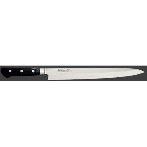 本研刃造り:プロの技術者により、本刃付けする前に研ぎなおしを容易にするため、水砥の荒砥・中砥を使用し、刃基を研ぎだしてあります。 サブゼロ処理:1050℃で焼き入れ後に、-73℃以下に冷却する特別な処理により高い硬度と靭性を与え、切れ味を一段と高めてあります。 刀身とハンドルはすき間のない一体構造で非常に衛生的です。 ハンドル部を空洞にし、軽くていつまでも美観を保つ「ステンレスモナカ構造」を採用。 また、18-8ステンレス鋼を使用し水・薬品等の高圧・高温殺菌洗浄を可能にした衛生的なハンドルです。 刀身/モリブデン・バナジウム鋼。 ハンドル/18-8ステンレス鋼。 刃の長さ:240mm。 厚口タイプ。 肉、野菜、魚、パンなど万能ですが、刃が薄いので堅い物を切ると刃欠けの原因になりますので注意して下さい。 お子様の手の届かない場所に保管して下さい。 料理以外に使用しないで下さい。 次亜塩素酸・塩素等での殺菌は使用しないでください。 取り寄せ商品となりますので状況によって在庫が無い場合がございますのでその際は速やかにご連絡いたします。