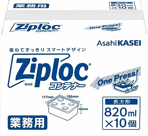 ◆商品名:Ziploc 業務用 ジップロック コンテナー 長方形 820mL 10個入重ねてスッキリ、スマートデザイン。 使用時も収納時もコンパクト!【品名】プラスチック製保存容器【原料樹脂】本体・フタ:ポリプロピレン【仕様】耐熱温度:140度耐冷温度:-20度内容量:800mL寸法(外形):縦117mm×横156mm×高83mm/41g【注意】・洗浄の際に、フタや容器のフチで手を傷つけるおそれがあるので注意する。 ・初めてご使用になる際は、洗浄してからご使用する。 ・火のそばに置かない。 ・冷凍庫から出した直後は割れやすいため、取り扱いに注意する。 ・オーブン、グリル、トースター機能、直火には使用しない。 ・食品が熱いままフタをしない。 変形のおそれがある。 ・液状のものを入れた場合、横にしない。 液体がもれるおそれがある。 ・食品の種類(カレー、ミートソースなど)によっては容器に色がつくことがある。 ・電子レンジ、オーブンレンジなどの調理器具や食洗機にて使用する場合は、その取扱説明書に従う。 ・廃棄時は各自治体の定める方法に従う。 ・使用期間中はパッケージを大切に保管する。 ★電子レンジ使用時の注意・加熱時はフタをずらしてご使用する。 ・電子レンジから取り出すときは、容器が熱くなっていますので気をつける。 ・油分の多い食品(カレー、シチューなど)の加熱調理は、耐熱温度を超えることがあるので、解凍までにとどめる。 ・糖分の多い食品や糖度の高い調味液(みそだれ、ウナギのたれなど)の加熱調理には使用しない。 急激に温度が上がり、耐熱温度を超えることがある。 ★食品衛生法に基づいて定められた「食品、添加物等の規格基準」に適合しています。