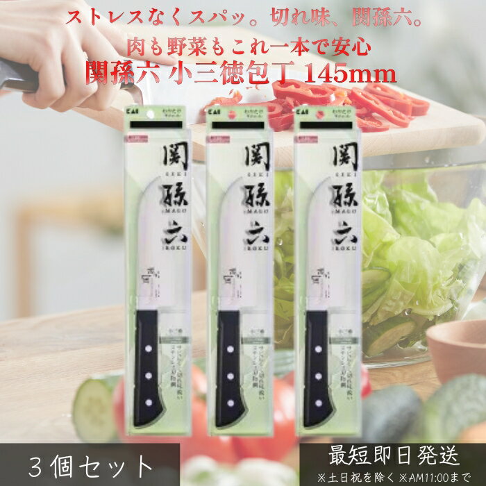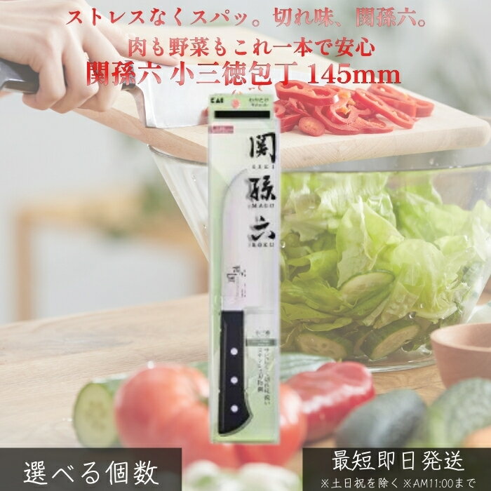 毎日の料理がもっと快適に。 扱いやすいサイズで、切れ味抜群。 関孫六「わかたけ」小三徳包丁 145mm。 関孫六 わかたけ 小三徳包丁 145mm(AB5421)は、日本の刃物ブランド「関孫六」の中でも、使いやすさと切れ味を両立させたエントリーモデルです。 丁寧な刃付けと鋭い切れ味で、食材へのストレスを最小限にし、毎日の調理を快適にサポートします。 軽量&コンパクトな145mmサイズだから、手の小さな方や初心者の方、サブ包丁としても最適。 野菜・肉・魚など幅広い食材に対応できる万能包丁です。 刃にはステンレス刃物鋼を採用し、錆びにくくお手入れも簡単。 柄は握りやすい形状で手になじみ、長時間の調理でも疲れにくい仕様です。 キッチンの主力としても、初めての一本としても活躍する包丁です。 ◆ 扱いやすい145mmの小型三徳 一般的な三徳包丁よりやや小さめで、取り回しの良さが魅力。 まな板上でも手元が見やすく、細かい作業も快適です。 ◆ 鋭い切れ味 × 錆びにくいステンレス刃 素材の味と美しさを損なわず、スッと刃が入る気持ちよさ。 錆びにくいので、日々のお手入れが簡単です。 ◆ 軽量&疲れにくい設計 手が小さい方でも握りやすく、コントロールしやすいハンドル形状。 料理がもっと楽しくなるバランスにこだわっています。 ◆ こんな方におすすめ ・使いやすい包丁を選びたい ・軽くて扱いやすいサイズが良い ・料理初心者の最初の一本として ・サブ包丁として小さめが欲しい ・野菜も肉も魚も万能に使いたい ◆ 製品仕様 ブランド:関孫六 わかたけ 種類:小三徳包丁(万能包丁) 刃渡り:約145mm 材質:ステンレス刃物鋼 用途:肉・野菜・魚など幅広い食材に対応 毎日の料理に、切れ味の良い相棒を。 関孫六 わかたけ 小三徳包丁で、キッチンの心地よい時間をお楽しみください。 類似商品はこちらTW-07 曲げわっぱ風弁当箱 小判型 茶 木1,280円?ベルディオ UVマイルドジェルN 80g │ 1,000円?貝印 ツメキリ type001 M 黒 Kai587円?オリヂナル ももの花 C 薬用フットクリーム 1,230円?ももの花 C ハンドクリーム 70g │ 手荒1,238円?ほたて貝の野菜 100g リケン 日本製 ユニ1,180円MH-01 マイティ ハンドキャリー 折りたた1,648円?新着商品はこちら2026/1/1AYURA アユーラ セラムオプティマイザー 2,728円2026/1/1アユーラ 薬用ハーバルホットスパ 医薬部外品 2,480円2025/12/27ももの花 C ハンドクリーム 70g │ 手荒1,238円?再販商品はこちら2026/1/9マルセイユ石けん オリーブ 無香料木箱ギフトセ3,280円2026/1/9UNO フォグバー しっかりデザイン 詰め替え850円?2026/1/9モリトジャパン is-fit 踏み抜き防止 イ1,118円?2026/01/10 更新ショップトップ > カテゴリトップ > 日用品 貝印 関孫六 わかたけ 小三徳包丁 145mm ×3個セット │ AB5421 ステンレス刃物鋼 軽量 使いやすい 万能包丁 初心者向け 肉 野菜 魚対応 錆びにくい 毎日使い 日本製ブランド 4,580 ~