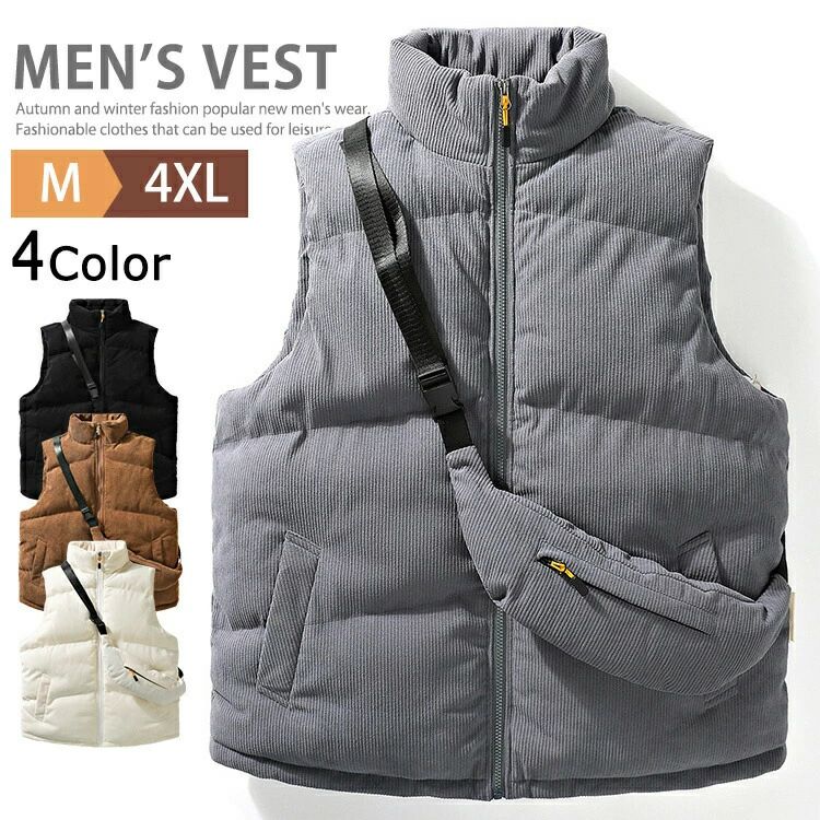 ベスト メンズ 中綿 コーデュロイ ジャケット アウター 中綿ベスト 防寒ベスト ボディバッグ付き スタンド ダウンベスト メンズベスト カジュアル 大きいサイズ 羽織り 厚手 男性 無地 秋冬 あったか ビター系 キレイめ ジレ チョッキ ZIP おしゃれ 4,615 ~