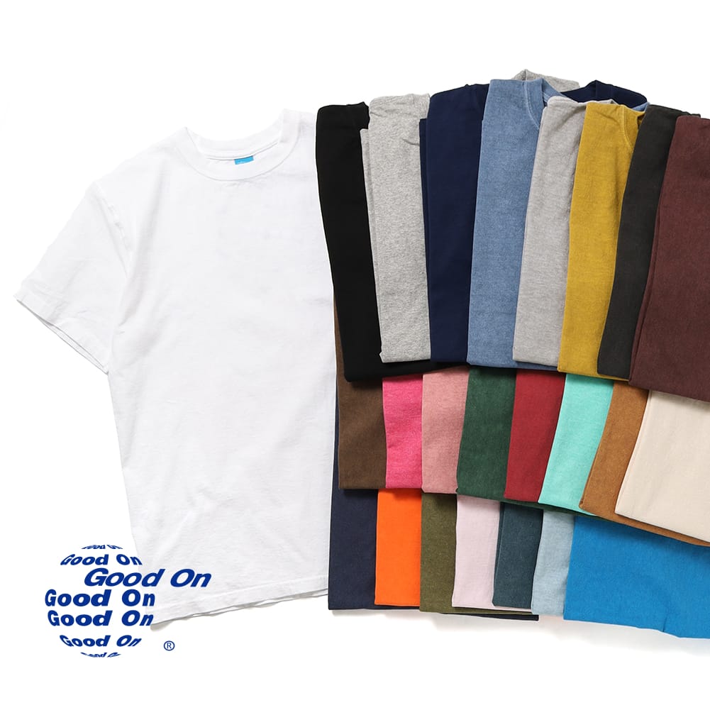 Good On(グッドオン)S/S CREW NECK TEE(ショートスリーブ クルーネックティー)Tシャツ 半袖 5.5オンス 米綿 USAコットン 丸胴 反応染め ピグメントダイ ガーメントダイ 先染め 日本製 ベーシックでタフって素晴らしい。 Good On(グッドオン)は、1997年に日本でスタートしたデイリーウェアブランド。 創業以来一貫してアメリカ産コットンを軸に素材を選定し、日常的に着続けられるタフさと、着用を重ねることで生まれる風合いの変化を重視したものづくりを続けている。 使用されるコットンは、繊維長が長く強度に優れるアメリカ綿を主体としたもの。 生地づくりから縫製、染色に至るまで耐久性を前提とした設計がなされており、洗濯や着用を繰り返しても型崩れしにくく、日常着としての実用性を高い水準で備えている。 デザインは極めてシンプルで、流行やシーズンに左右されないベーシックな構成が基本。 装飾性よりもパターンバランスや着心地、可動性を重視し、年齢やスタイルを問わず自然に馴染む佇まいを目指している点が特徴だ。 また、後染めや顔料染めなど、製品染めを積極的に取り入れている点もGood Onを象徴する要素のひとつ。 色合いは新品時の完成形ではなく、着用と洗濯を重ねることで少しずつ表情を変えていくことを前提としており、経年変化そのものをデザインの一部として捉えている。 Good Onのプロダクトは、いわゆる流行服ではなく、毎日の生活の中で自然と手に取られる存在であることを目指したスタンダードウェア。 着る人の時間とともに完成していく服として、国内外のセレクトショップから長く支持され続けている。 Good Onを代表する、もっともベーシックなショートスリーブクルーネックTシャツ。 良質なUSAコットンを使用した5.5オンスのコットンジャージー生地を採用し、タフに着られてヨレにくい一方で、日常着として心地よく着続けられるバランスに仕上げられている。 生地には肌あたりがやさしく強度にも優れた高品質のUSAコットンを使用。 日本の気候に適した厚みと、日本人の体型を考慮したサイズ設計により、洗濯を繰り返しても安心して着用できる安定感を備えている。 アームホールや裾、袖口、ネックリブの縫製には、製品に大きな負荷がかかる後染め加工にも耐えうる2本針のカバーシーマを採用。 肌への当たりを抑えながら、日常使いに十分な耐久性を確保している点も特徴だ。 あえて長めに設定されたステッチピッチは、古き良きアメリカのカジュアルTシャツを思わせる表情を持ち、製品染めによる風合いや経年変化によるアタリを、よりくっきりと引き立ててくれる。 襟元には、伸びを抑制するため首後ろから両肩にかけて共生地によるテープ補強、いわゆるタコバインダー処理を施し、繰り返しの着用や洗濯にも配慮した構造となっている。 また、素材となるコットンの縮率を踏まえてパターンを設計している点もGood Onならでは。 染色後にもっとも縮んだ状態を基準とし、着用を重ねることで生地が自然に馴染み、最適なサイズ感へと近づいていくよう計算されている。 胴体部分は丸胴編みにより筒状に編み立てられており、脇に縫い目がないため、見た目も着心地もすっきりと軽やか。 ほつれやヨレ、斜行が起こりにくく、長く付き合える一枚として完成度の高い仕上がりだ。 反応染めカラーは落ち着いた発色で、ベーシックかつ上品な印象に。 ピグメント染め(顔料染め)カラーは、生地の凹凸に生まれる色の濃淡が特徴で、洗濯を重ねるごとに少しずつ色褪せし、風合いを深めていく。 タフさと着心地、そのどちらも妥協せず、日常の中で自然と手に取れる一枚。 確かな素材選びと縫製仕様を備えながら、手に取りやすい価格帯を維持している点も魅力で、Good Onらしいものづくりを最も素直に体現した定番Tシャツだ。 ■商品番号/ GOST-701 サイズ(cm) 着丈 身幅 肩幅 袖丈 S 63 46 41 19M 65 50 46 19.5L 68 54 48 20XL 70 58 50 21 ※製品染め後に洗濯乾燥済みのため最も縮んでいる状態です。 着用していくうちに詰まっている編み目が緩み身体に馴染んでいきます。 着用サイズ:▼男性モデル:Lサイズ着用 身長176cm/60kg■素材/5.5 oz Jersey コットン100% ※メタルグレー:5.5 oz Mock Twist Jersey コットン100% 染色技法 反応染め 顔料染め ※メタルグレー 先染め ※製品染め商品の特性上、染め上がりのお色やサイズに若干の個体差がございますので予めご了承ください。 また、独特のユーズド感のある表情、多少のゆがみや擦れ、縫い目部分のしわ、編み地の筋やムラなどは製品の特徴です。 特有の不均一感やラフ感をお楽しみください。 ■原産国/MADE IN JAPAN メーカー希望小売価格はメーカー商品タグに基づいて掲載しています 【返品交換送料無料】Good On(グッドオン)S/S CREW NECK TEE(ショートスリーブ クルーネックティー)Tシャツ 半袖 5.5オンス 米綿 USAコットン 丸胴 反応染め ピグメントダイ ガーメントダイ 先染め 日本製 5,500 ~