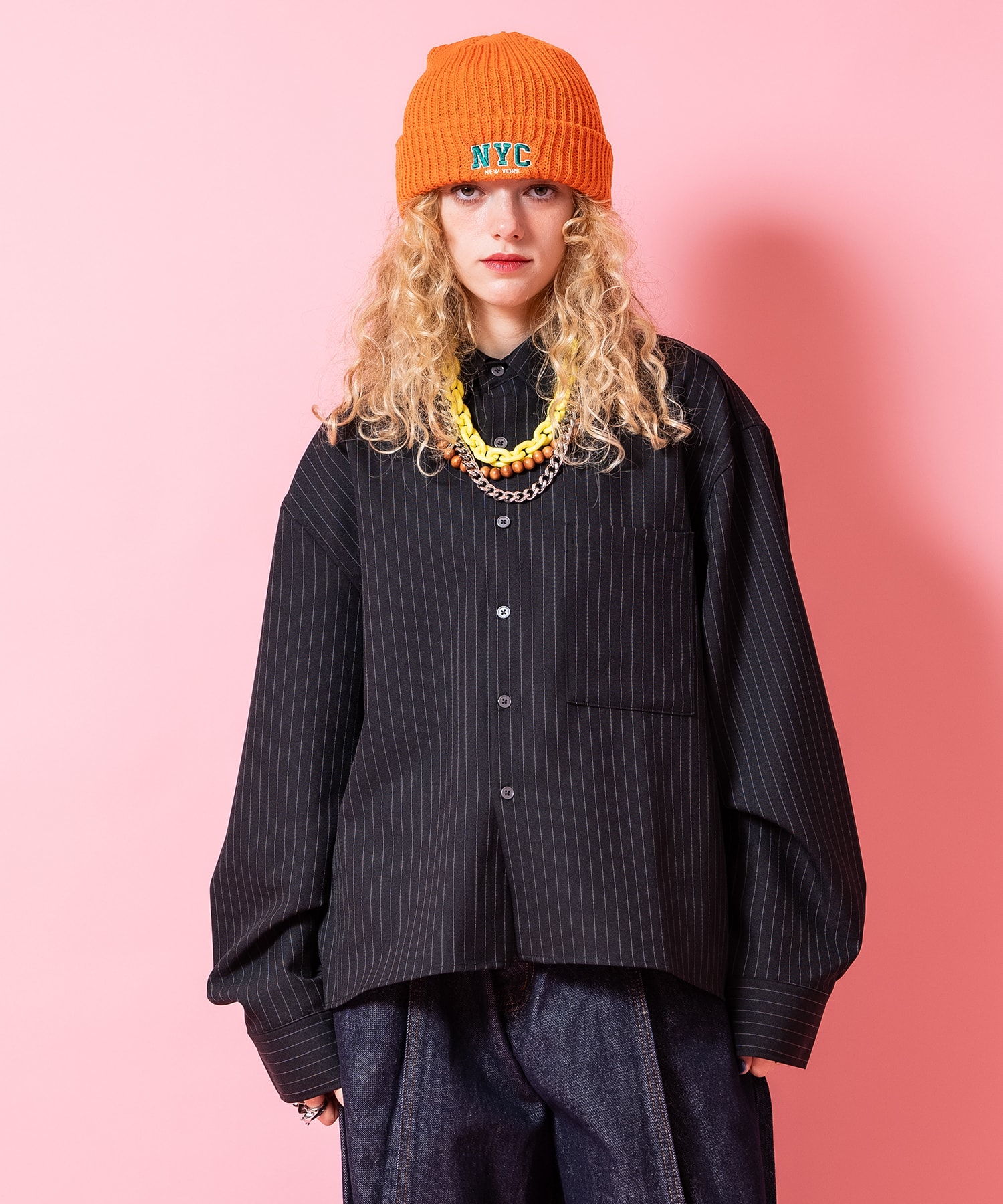 オーバーサイズクロップド丈ストライプジャージーシャツ / ユニセックス メンズ レディース 短丈 柄 ブラウス 長袖 胸ポケットどこかレトロな雰囲気と上品な「キチンと感」を感じさせてくれるトレンドのストライプ柄シャツ/ブラウス。 クラシックな定番アイテムながら90sやY2K、古着ミックススタイルなどのトレンドの流れで逆に今新鮮なワンデザインで、メンズレディース問わずユニセックスで取り入れたい一枚。 90sリバイバル、Y2Kスタイルの流れや古着ミックススタイルなどトレンドのムードから大注目の短丈シルエット×「上品」をしっかりキープする悪目立ちしないタイトピッチ&薄めのカラーで入れたピンストライプ柄がグッドムード。 ストレッチ感あるサラっとした肌ざわりのポリエステルジャージー生地をベースにした古臭くなり過ぎないクリーンなニュアンスが現代モード的。 バック丈をフロント丈より長めにとったナチュラルなデザインのショート丈以外をルーズなオーバーサイズでパターン二ングしたトレンド感あるクロップド丈スタイルがストリート&エレガントな一枚。 90s/Y2Kスタイル、古着ミックス、アメカジやワークスタイルなどのクラシックムードなスタイルはもちろん、韓国ストリートファッション、スケーター、ストリートスタイル、グランジといったカジュアル全般、さらにはモードスタイルやキレイメなどのハズシアイテムやアクセントとしても◎『カラー』ブラック / 黒【a.p.o.v. / エーピーオービー】a point of view...[日本人の視点]からセレクトする『韓国ストリートファッション』がコンセプト。 韓国ストリートで日々更新されてゆくトレンドの移り変わりを眺めながらぼんやりと視点を合わせて国内外問わずにセレクト。 ぼーっと韓国ストリートシーンからインプット、日本人視点でアウトプット。 ■サイズ■onesize着丈:66.5身幅:63.5そで丈:61.5肩幅:53■素材■ポリエステル:100%■カラー■ブラック■モデル■174cm166cm