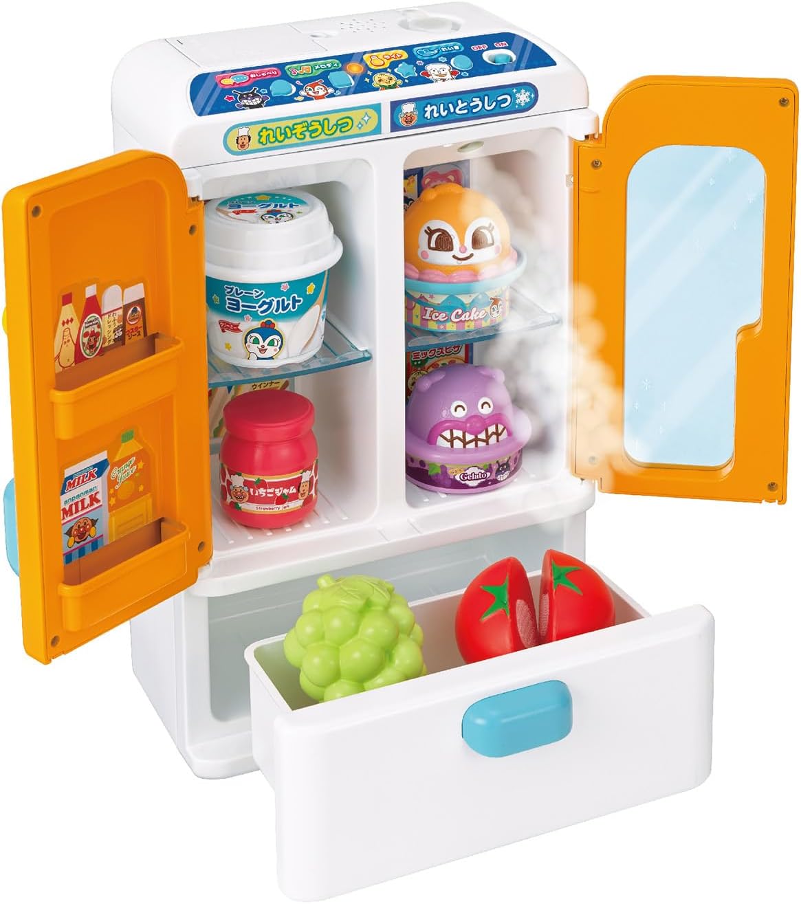 食材をれいぞうこに入れ、補給口から水を入れて電源オン! とびらを開けると、アンパンマンのおしゃべりが流れ 冷気がシューッと吹き出します。 (※冷気の実際の温度は常温です。 ) 同時に「アンパンマンのマーチ」のメロディが流れます。 本体上部にあるスマートパネルには、おしゃべりボタン、メロディボタン、 ライトボタン、れいきボタンの4つのボタンがあり、 スマートパネルでも操作ができちゃいます! スマートパネルのおしゃべりボタンを押すと、 「れいぞうこの中には何があるかな〜?」など アンパンマン、ばいきんまん、ドキンちゃんの楽しいおしゃべりが流れます。 メロディボタンを押すと「アンパンマンのマーチ」が流れ、 音楽に合わせてパネルのLEDがピカピカ光ります。 れいきボタンを押すと、水蒸気を止めたり出したり操作ができます。 (水蒸気は20秒のおやすみごとに5秒間吹き出します。 ) 食材は、パカっとわれるトマトトントンをはじめ、 ばいきんまんアイス、ドキンちゃんアイスケーキ、 いちごジャム、マスカット、ヨーグルトの6個入っています。 高さ32cmの大きなアンパンマンのれいぞうこでおままごと遊びを楽しもう♪ 【セット内容】 本体、ひきだし、棚板2枚、 マスカット、トマトトントン、 ドキンちゃんアイスケーキ、ケーキスタンド、 ばいきんまんアイス、ヨーグルト、 いちごジャム、スポイト 商品名:冷気がシュ〜 スマートアンパンマンれいぞうこDX 対象年齢:3才から サイズ:W200mm×H321mm×D136mm 電池:単3電池×3本(別売) 検索ワード アンパンマン 冷気がシュ〜 れいぞうこDX スマートアンパンマン 冷蔵庫 おままごと ごっこ遊び ままごと キッチン ミニ冷蔵庫 ジョイパレット 知育玩具 3歳以上 電池式 水蒸気 冷気 演出 ドア開閉 扉付き スマートパネル メロディ LED ライト おしゃべり アンパンマンマーチ ばいきんまん ドキンちゃん トマト マスカット ヨーグルト いちごジャム ケーキスタンド アイス ケーキ 小物パーツ 冷凍室 野菜室 引き出し 子供玩具 幼児遊び 室内遊び 食育 想像力 小さな子 ギフト 誕生日プレゼント クリスマス プレゼント キッズ おもちゃ シミュレーション キッチンごっこ 幼児 キッズギフト インテリア玩具 キャラクタートイ 食材パーツ 冷蔵庫玩具 安全設計 省スペース 模造冷蔵庫 装飾付き スチーム風演出 冷蔵庫デザイン セット遊び 声付き パネル操作 子ども遊び メロディ遊び スチーム演出 アイストイ 冷蔵庫ドア 玩具冷蔵庫 コンパクト 子どもキッチン 小型玩具 キッチンセット キッズ冷蔵庫 室内ごっこ 水を使わない 模擬冷蔵庫 知育ままごと 知育遊び 家庭遊び プレ幼児 知育ギフト キッズ教育用品 マーチ音楽 アンパンマンキャラクター クリスマス 3歳 クリスマス 4歳 クリスマス 5歳 クリスマスプレゼント 3歳 クリスマスプレゼント 4歳 クリスマスプレゼント 5歳 ジョイパレット アンパンマン 冷蔵庫 冷気がシュ〜 スマートアンパンマンれいぞうこDX アンパンマン おもちゃ 男の子 女の子 3歳 4歳 5歳 誕生日 ギフト プレゼント おままごと ままごと ごっこ遊び 知育 育脳 知育玩具 育脳玩具 冷気が出る キッズ 孫 子供 6,790 ~