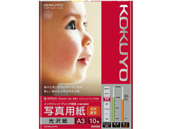 【商品説明】●鮮やかな仕上がり/色彩の発色表現を豊かに表現できる特殊コーティングを採用。 表面の滑らかな光沢が、さまざまな写真を鮮明に再現します。 ●しっかりした厚み/0.22mmの十分な厚みが高級感を演出。 シワになりにくく、耐水性も高いため、一般的なスナップ写真などの大量印刷にも手軽に使えます【仕様】●注文単位:1冊●紙厚:186g/m2・0.22mm●白色度:98%程度(ISO)【備考】※メーカーの都合により、パッケージ・仕様等は予告なく変更になる場合がございます。 【検索用キーワード】コクヨ KOKUYO こくよ コピーペーパー コピー用紙 インクジェット用紙 プリント用紙 光沢紙 A3 インクジェット用紙 インクジェット用紙(光沢紙) KJ−G13A3−10N KJG13A310N RPUP_02 R62255豊かな発色表現と美しい光沢で、写真を気軽に印刷できるしっかりした厚みの光沢紙 【レビュー投稿で100円OFFクーポン】【お取り寄せ】コクヨ インクジェット 写真用紙 光沢紙 A3 10枚 KJ-G13A3-10N A3 インクジェット用紙 光沢紙 1,205 ~