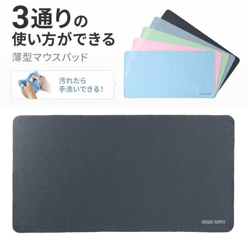 マウスパッドとしても使用できるが、ノートパソコンに挟んで持ち運びが可能で、ノートパソコンの液晶保護にもなる。 クリーニングクロスとしても使用できる3WAYのマウスパッド。 <特長>●スムーズな操作が可能でマウスソールにも優しいソフトな表面素材です。 ●薄型でノートパソコンに挟んで持ち運べます。 (13.3〜14インチ対応)●パソコンの持ち運び時にキーボードと画面の接触による傷を防ぎます。 ●クリーニング効果があり液晶画面クリーナーとしても使えます。 ●裏面は滑り止め効果の高いシリコンドット加工です。 ●汚れたら洗濯可能です。 (優しく中性洗剤で手洗い)<仕様>■カラー:グレー■材質:表面/ポリエステル、マイクロファイバー(ポリエステル)裏面/シリコン、シリコンドット加工■大きさ:大型■薄型:○(0.5mm以下)■サイズ:約W285×D150×H0.5mm■重量:約14g■保証期間:初期不良のみ■対応機種:13.3〜14型ワイドのノートパソコン<関連キーワード>ノートパソコン用3WAYマウスパッド グレー MPD-NOTE3GY 4969887370810色ちがいブラックブルーグリーングレーピンク マウスパッド パソコン液晶保護 クリーニングクロス 3WAY 超薄型 ノートパソコン すべり止め 手洗い可能 グレー MPD-NOTE3GY サンワサプライ 1,330 ~